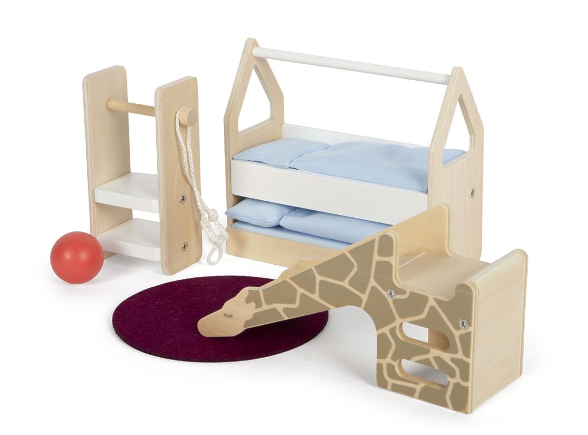 What a beautiful room! Your children will surely love it too. This children's room is not only a beautiful addition to any dollhouse, but it also motivates children to engage in creative play and develops their imagination. It is designed to closely resemble real furniture. Included is a house-shaped bed with a pull-out guest bed, bedding, a shelf with a rod for hanging clothes, a ball, a jump rope, and a large play mat. And the best part: the Giraffe slide, which was created based on the real Giraffe Wildlife children's slide (item number: 12424). Main features: modern and elegant furniture for a children's room, Giraffe slide created based on a real children's slide, develops imagination and motivates creative play.