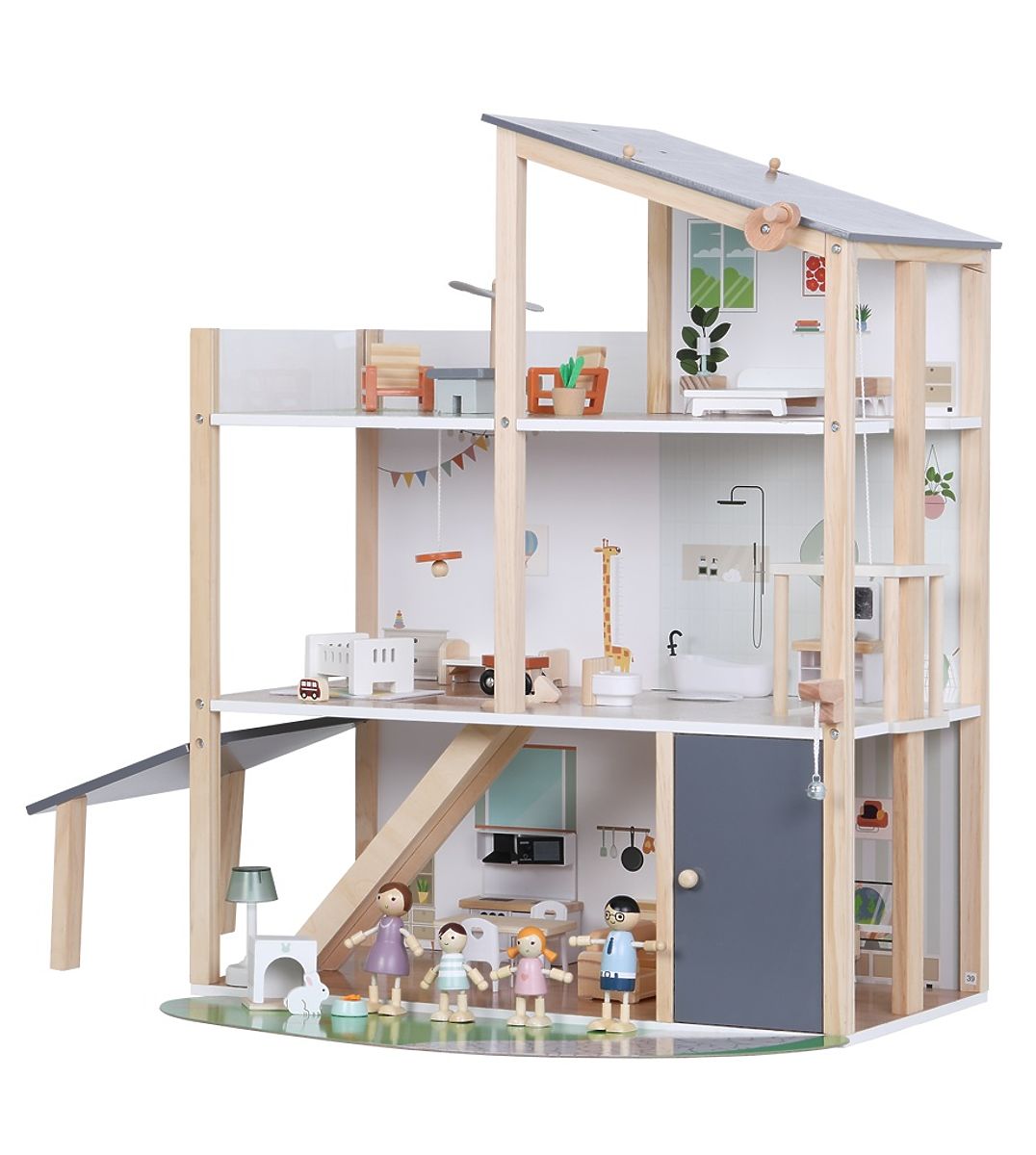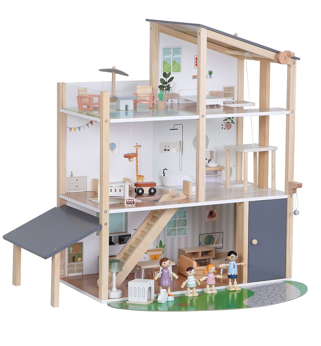 Welcome to the dollhouse where living is pure joy! This spacious wooden house is fully equipped with furniture and accessories. Inside, you'll find a roomy kitchen connected to a cozy living room, a stylish bathroom with a bathtub, a children's room, a bedroom, and a luxurious rooftop terrace for relaxation. And that's not all; there's even an elevator. Turn the crank to take the family up to the second floor. The set includes an adorable pet rabbit with its own house and a four-member family ready to settle in and start their story. Children develop their imagination, social skills, and attention to detail while playing. Above all, they have a great time! The playful design, soft colors, and quality craftsmanship make this toy a beautiful addition to any room or playroom. The dollhouse is delivered unassembled and requires assembly. An assembly manual is included in the package. Main features: 41 pieces, fully equipped wooden dollhouse with 4 family figures, encourages imagination, creativity, and role play, leads to imaginative play, quality craftsmanship and attractive design, delivered unassembled, assembly required, assembly manual included, suitable for children from 3 years.