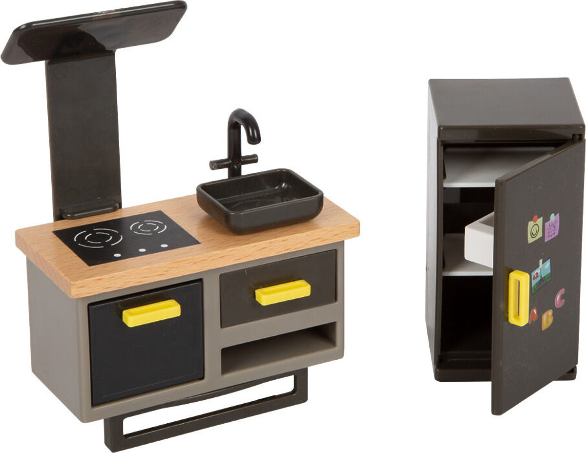 This modern dollhouse features an open front with beautiful artistic details and a contemporary interior. It includes a combined kitchen with a dining area, .. more