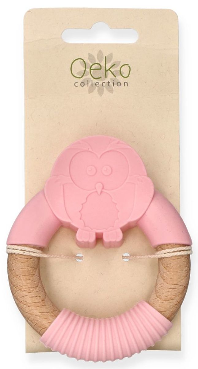 Itchy gums are no longer a problem. Here is not only a practical product but also a beautiful ornament and hand toy with a pink owl motif. Thanks to the use of safe silicone, a child can chew on this product without fear of harmful substances entering their body. The wooden ring, onto which the soft silicone surface is attached, is ideal for chewing. The protrusions on the teether and the striped attachment will surely soothe sore gums from which little teeth are growing.