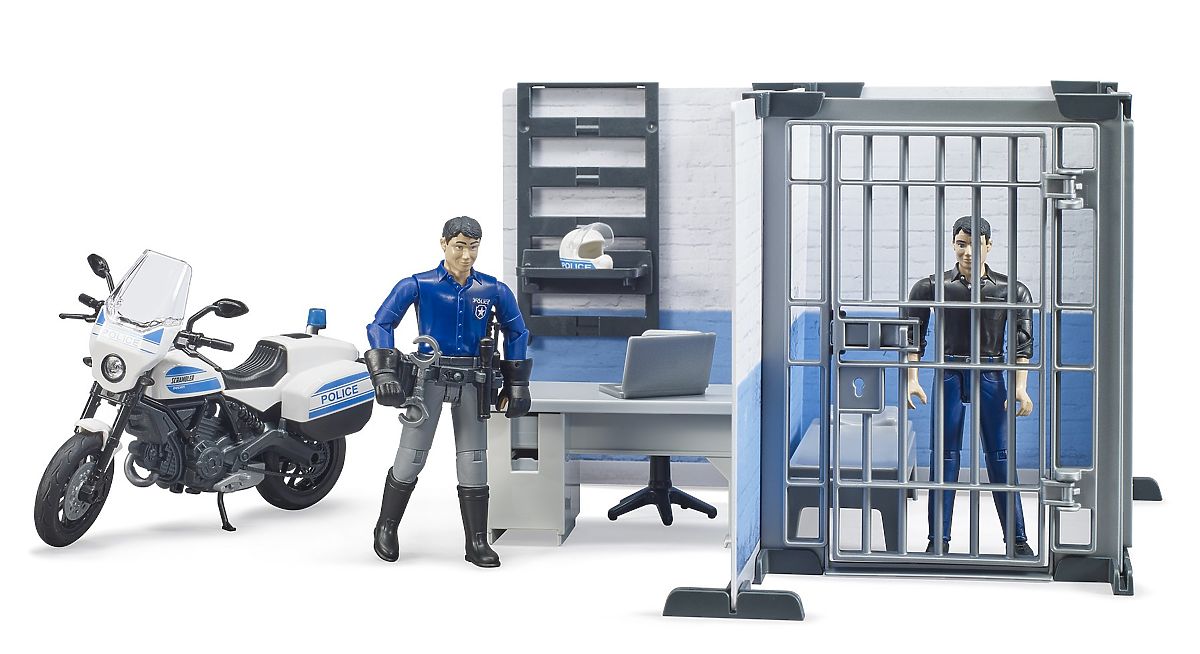 For the wide range of BRUDER police vehicles, there is a new BWORLD police station serving as a coordination center. In the office section, the police officer can coordinate and monitor every mission using the most modern equipment. If a suspect is caught, they can be detained in the cell. The Scrambler Ducati police motorcycle in front of the station is ready to spring into action. The station can be easily combined with other BWORLD sets. It offers accessories in the form of police vehicles. Made in Germany from quality materials. Main features: police officer figure with equipment and motorcycle, detained figure, 2 double-sided printed station walls, 2 lattice parts including doors, shelving unit, chair, table, bed, and laptop, made in Germany.