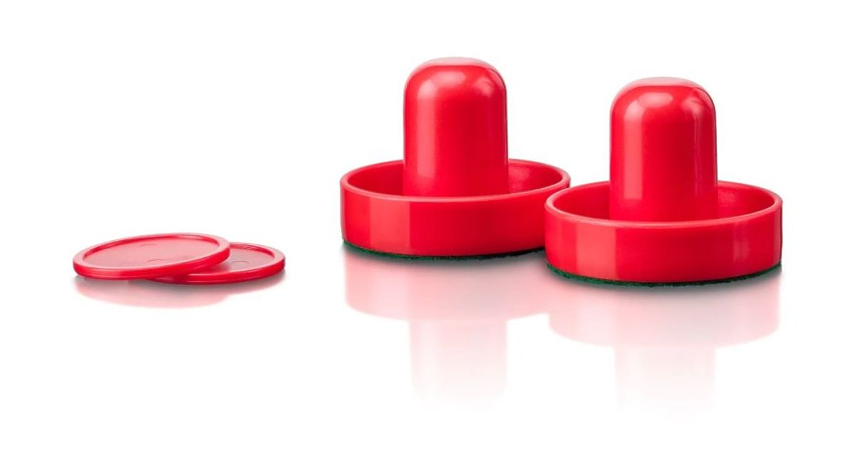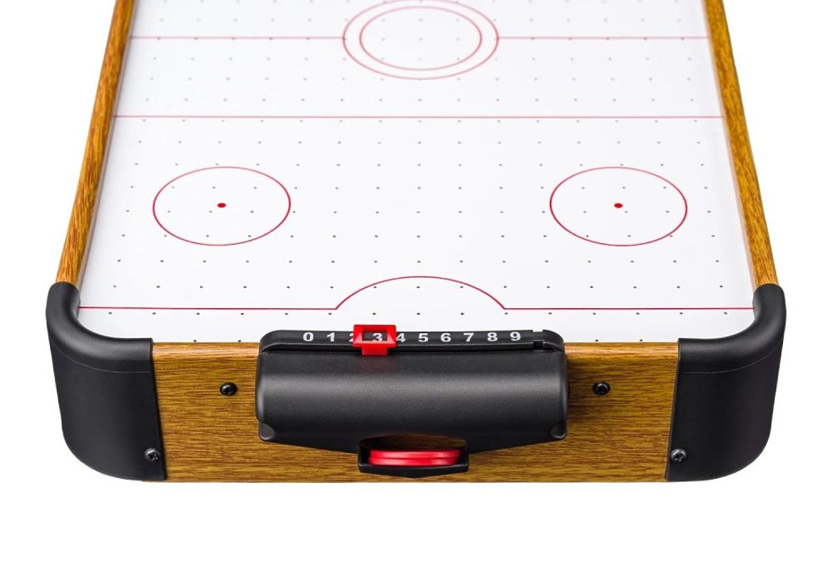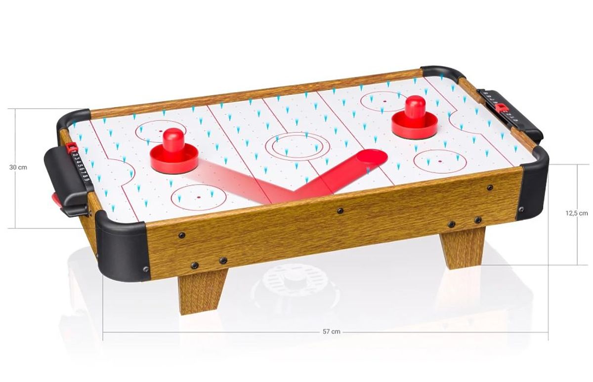 The game table is almost ready to use right out of the box; you just need to attach two goals with score counters and the legs. Once the toy is turned on, the puck glides smoothly from goal to goal. Each player, equipped with a special striker, must defend their goal while trying to hit the puck into the opponent's goal. Great fun and lots of excitement guaranteed.