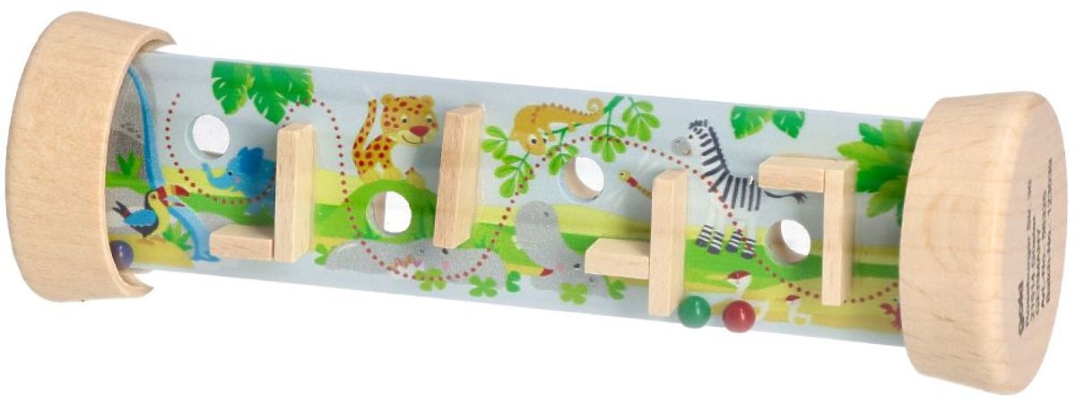 Inside the transparent cylinder, there is a board with four holes and marbles. The game involves manipulating the cylinder so that all the marbles fall into the holes. Each side of the game is slightly different due to the pattern on the board and the different surroundings of the holes with wooden barriers. Additionally, the marbles come in four colors, and on one side, each hole is marked with the color of the marble that needs to be placed in it. So, from one side, it's a bit easier, but from the other side, we have an additional challenge.