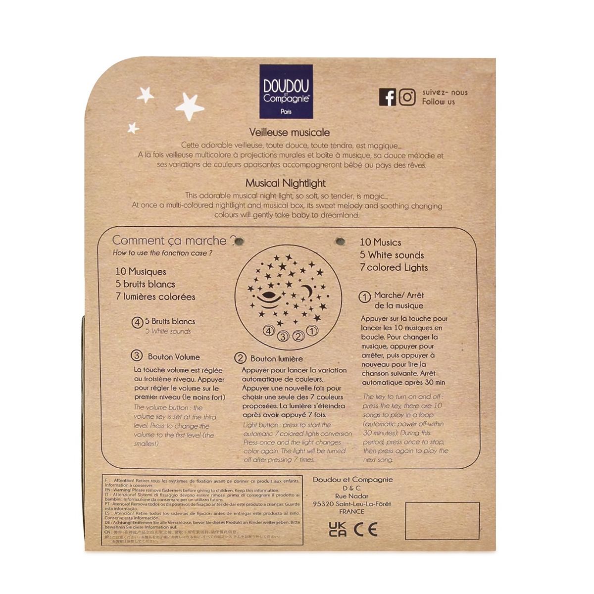 Who's still awake here? With this adorable bunny, putting your baby to sleep will be a breeze. The bunny, made of soft material, is perfect for cuddling and features a music box on its belly with a projection of the universe in 7 colors. It plays 10 gentle melodies and 5 soothing sounds that will lull your baby to sleep and promote relaxation and quality rest. Using 4 buttons, you can adjust the volume, various playback modes, and individual color modes. You can choose an automatic mode where melodies play repeatedly or select a specific track. Similarly, you can set an automatic light mode where colors change smoothly or choose your favorite color. Visual and auditory stimulation aids in the sensory development of the child. This music box with projection is a beautiful gift for any child from birth. Maintenance: Wash the bunny in a 30° bath (remove the music mechanism before washing). Dry naturally or at a low temperature. Main features: plush toy and music box with projection in one, music box is removable for easy maintenance, visual and sensory stimulation, soft plush, compliant with European CE standards, suitable as a gift or accessory for a child's room, powered by 3 AAA/R03 batteries (not included), suitable from birth.