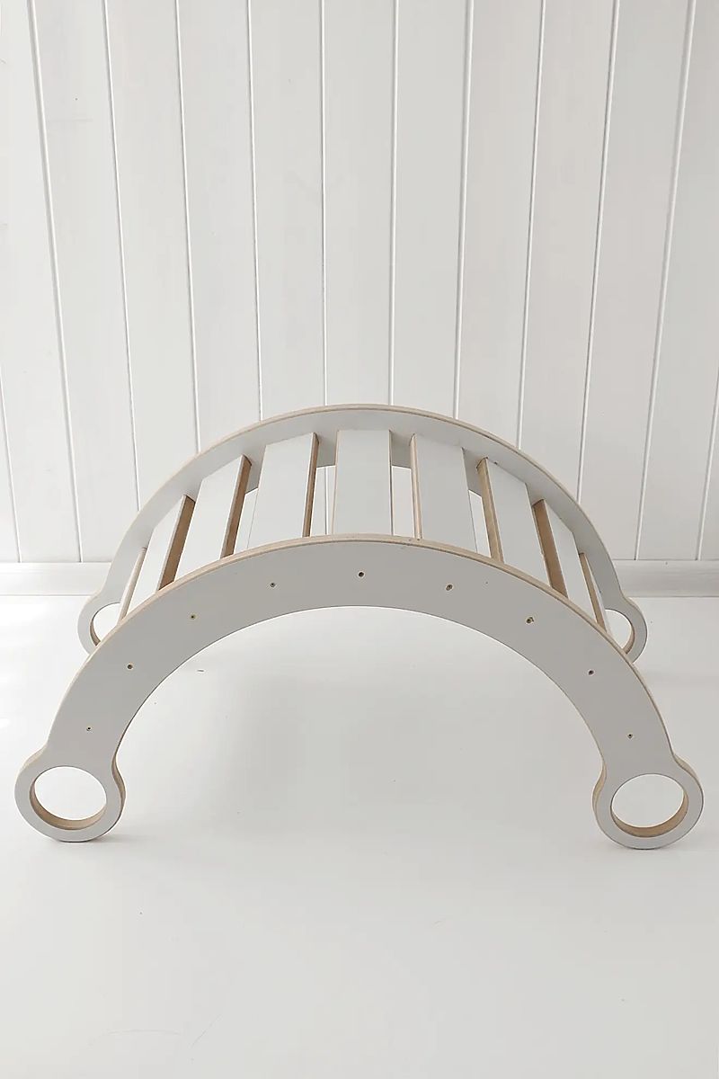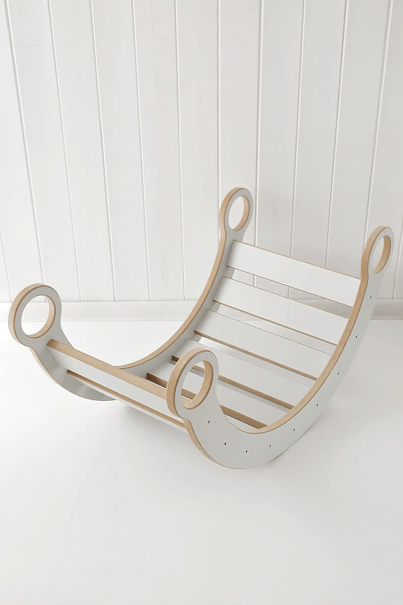 Stylish Wooden Montessori Swing S in white is perfect for any children's playroom or bedroom. This multifunctional element not only provides fun swinging but also offers creative play opportunities – as a base for building, a secret hideout, or small shop counters. It naturally supports the development of children's motor skills, balance, and strength. The Montessori Swing S is safe and durable due to its robust construction and the use of quality materials. Its simple and timeless design easily fits into any interior, providing children with hours of fun while contributing to their physical and mental development.