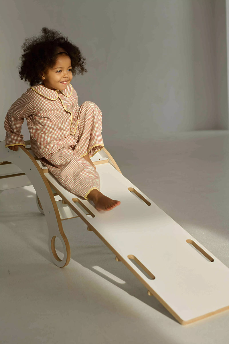 The stylish wooden Montessori swing with slide and ladder in a natural color is perfect for any children's playroom or bedroom. This multifunctional set offers not only fun swinging but also the opportunity to climb the ladder and slide down, naturally promoting the development of motor skills, balance, and strength in children.