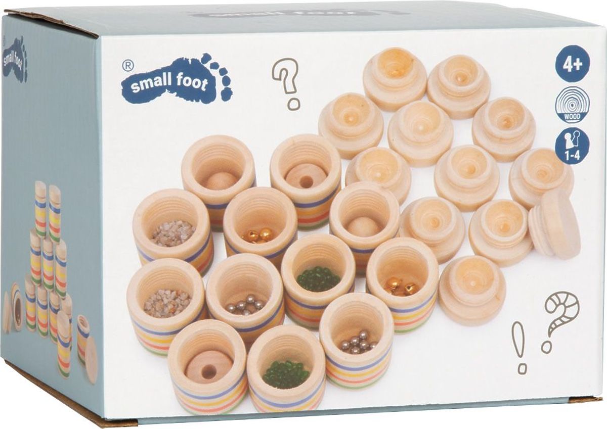 The goal is to find two elements that make the same sound. The rules are very simple, practically the same as the regular Memory game, with the difference that when you select 2 cups, you need to shake their contents to see if you've found the same pair. If in doubt, you can always unscrew the cup to check if the pair really matches.