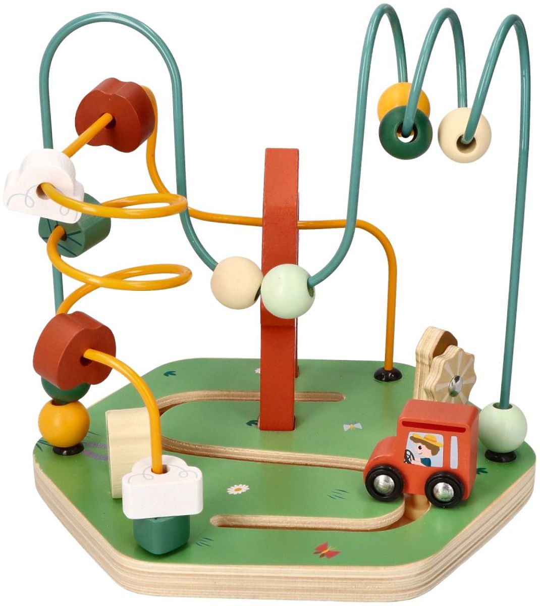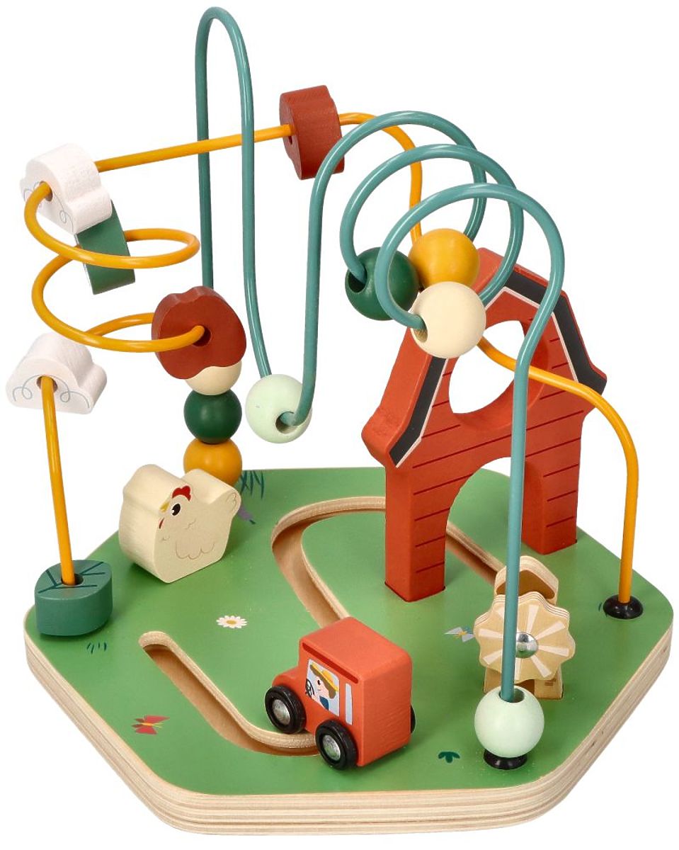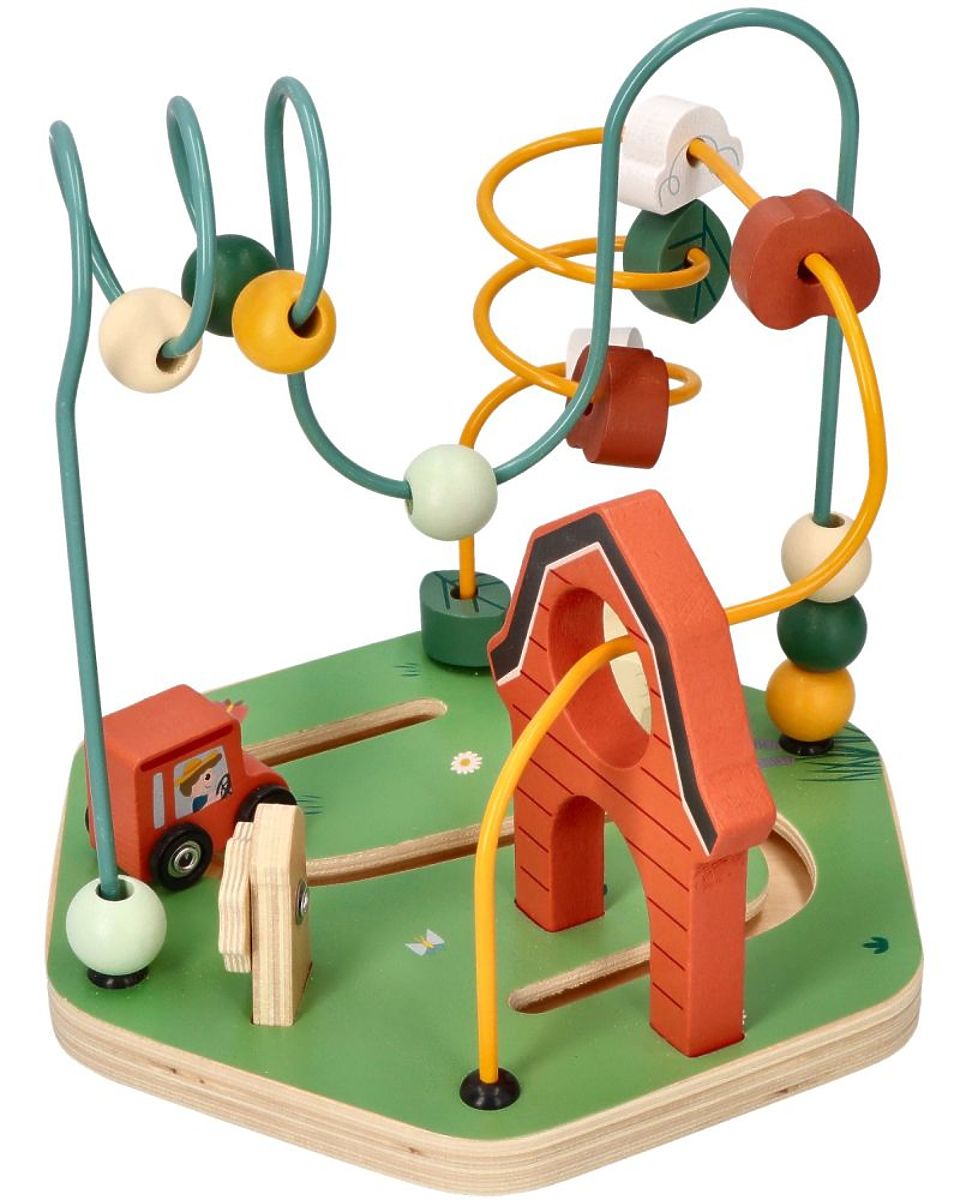 On two colorful metal rods (green, yellow), there are wooden beads that the child can move freely, practicing precision in finger and hand movements. There are a total of 14 wooden blocks and beads on the loops. One of the loops has obstacles that make moving the beads a bit more challenging. Additionally, the toy's base forms a track where the new owner – as befits a farm – can drive a tractor and watch over their property. Overall, it creates a very colorful and joyful toy that will surely provide your child with a pleasant time.