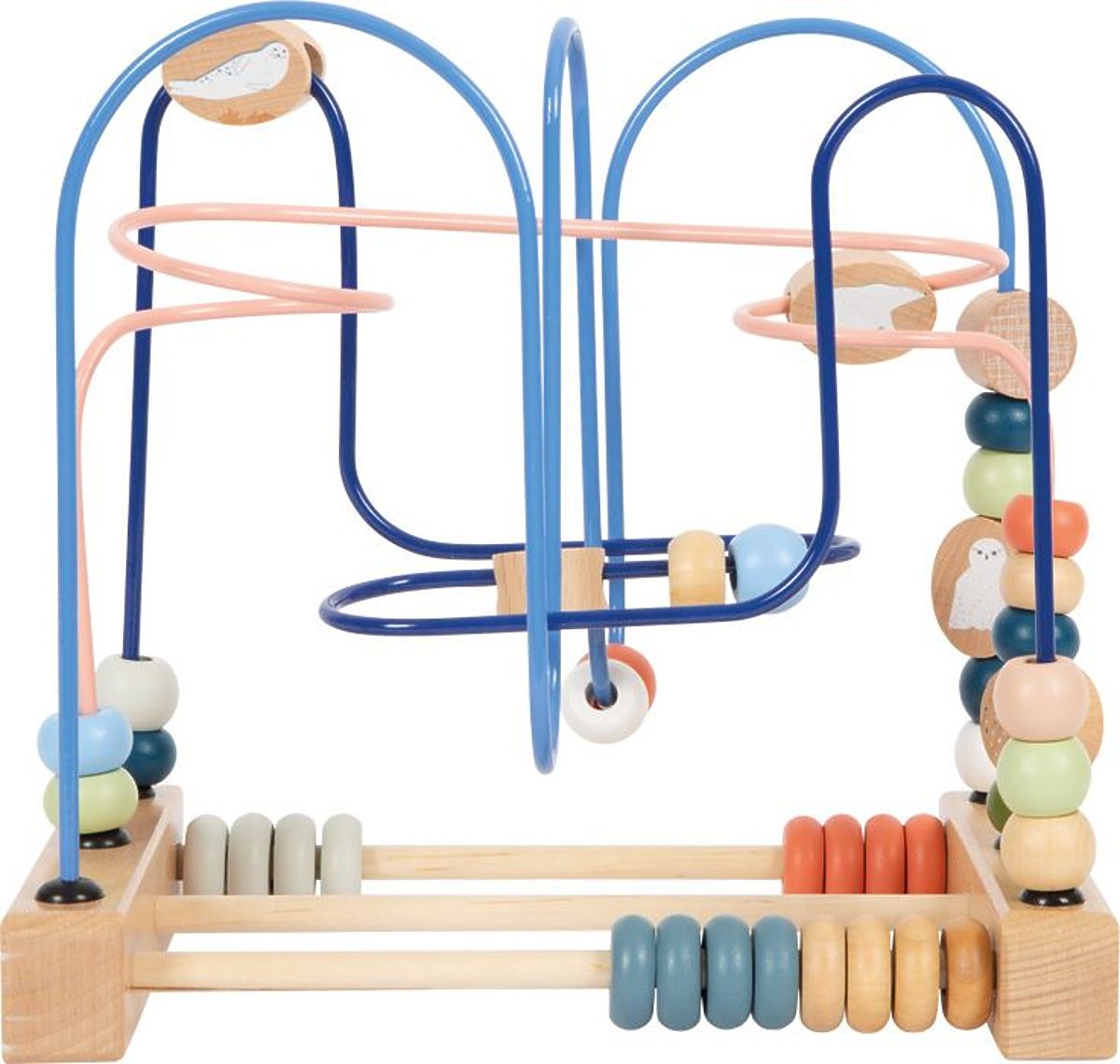 On three colorful metal rods (dark blue, pink, and blue), there are wooden beads that the child can move freely, thus practicing precision in finger and hand movements. Additionally, the loops feature 3 blocks with images of Arctic animals: a snowy owl, a white polar bear, and a white seal. At the base of the loop, there are 2 tracks with colorful sliding beads for learning counting.