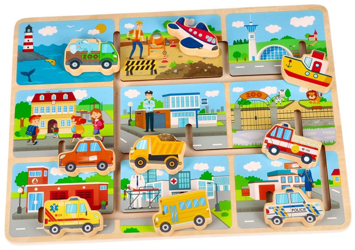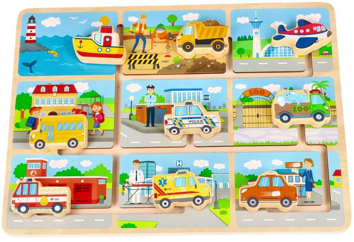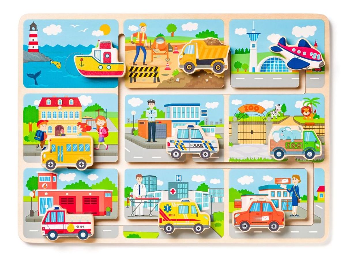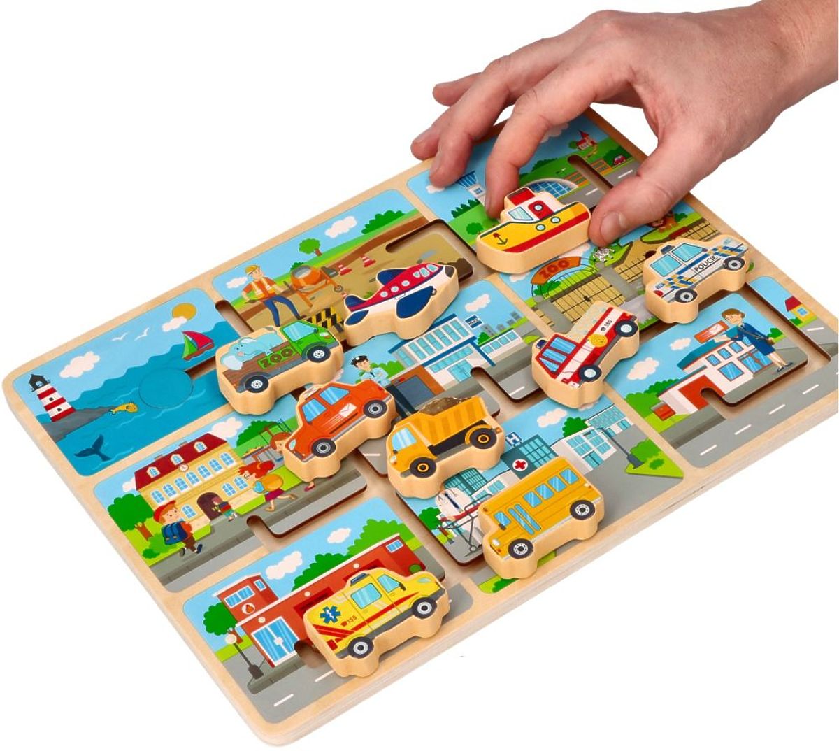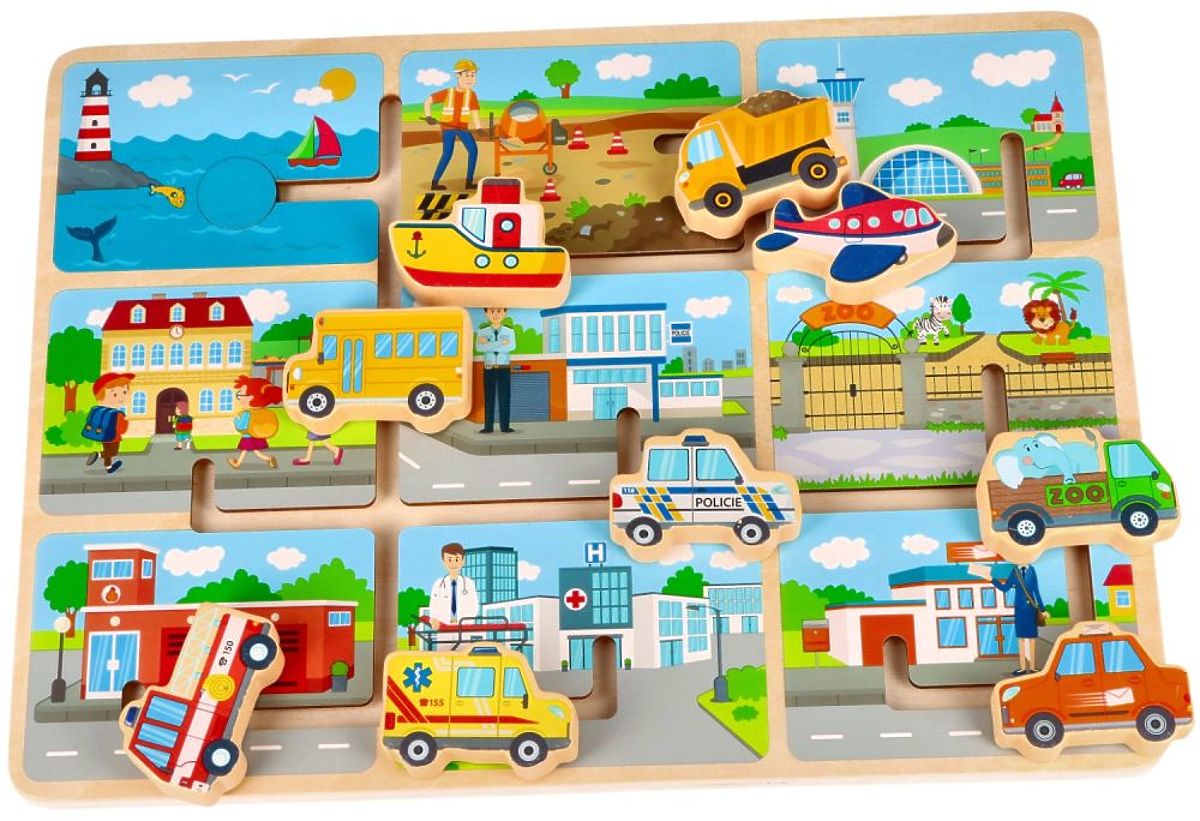 The puzzle is made of wood. On the wooden base, there is a maze and 9 vehicles that need to be parked under the corresponding building. You will find, for example: a boat, an airplane, a truck, or an ambulance.