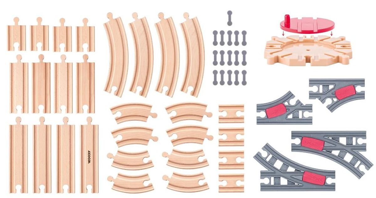 The track elements are compatible with products from other manufacturers such as brands: Brio, IKEA, ELC, Little Steps, Eichhorn, Woodyland, Tesco, Carousel, Bigjigs, etc., so it is easy to extend the track or connect it with another track.