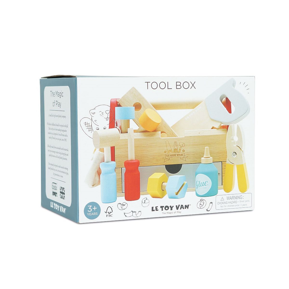 Engage young minds and hands with this traditional toy. The wooden tool set in a crate for boys and girls is perfect for motor skill training during imaginative play. The package includes a crate, a fabric bag, pliers, a screwdriver, a perforated board, two nails, a bolt with a nut, wooden glue, and a hammer. Made from sustainable wood, painted with non-toxic water-based paints. Toys with a purpose: All Le Toy Van toys are made to last. Lovingly designed by experienced craftsmen using ethical practices and sustainable materials that are kinder to our planet. Main features: ethically made from sustainable wood, tested to the strictest standards, painted with non-toxic water-based paints, inspires imaginative play, develops cognitive skills. Toy Awards: Junior Design Awards Shortlist 2018, Good Toy Guide Recommended. Cars & Construction: The award-winning Le Toy Van construction and motor skills collection. To date, it has won over 15 awards for imaginative cars and construction toys. They support children's imagination, are perfect for imaginative play, enhance creativity, and playfully improve children's hand-eye coordination. The FSC® (Forest Stewardship Council) brand and certificate guarantee that the wood from which the product was made was not illegally harvested and comes from responsibly or naturally managed forests, where strict environmental and social requirements are met. The FSC® label on the product means that by purchasing it, you are helping to protect forests and support responsible, sustainable, or nature-friendly management, making our forests more stable, healthier, with a natural species composition, and better able to withstand the negative effects of climate change.