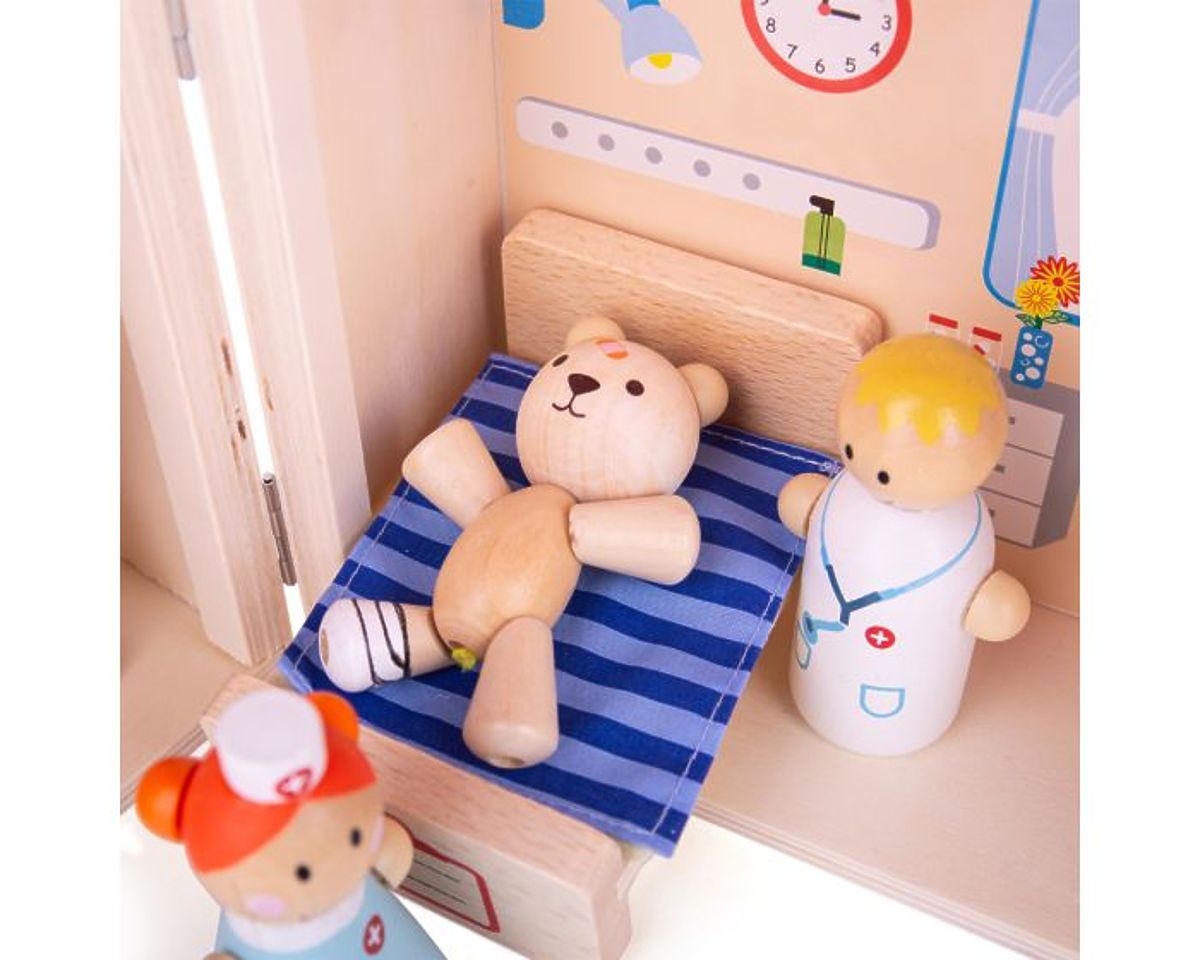 Mr. Bear bumped his head! This colorful wooden mini hospital play set features elements inside and out and comes with a hospital bed, medical drip, heart .. more