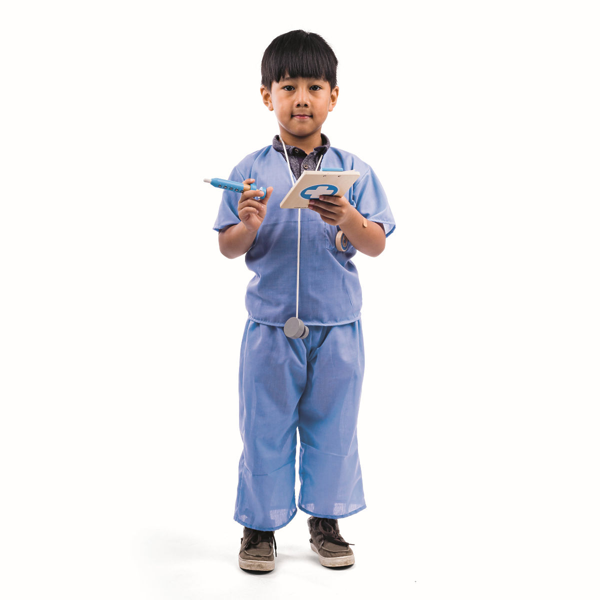 Help children treat teddy bears, dolls, or family members with this realistic-looking children's healthcare costume. This doctor dress-up set includes a blue shirt, pants, a wooden stethoscope, medical charts for children to write diagnostic notes, a thermometer, pocket watch, syringe, and bandages. Velcro fastenings for easy dressing and undressing. The costume is made of cotton and polyester, machine washable. Main features: perfect for treating sick teddy bears or dolls, helps develop imagination, speech, and social skills, helps alleviate fear and anxiety about visiting the doctor.