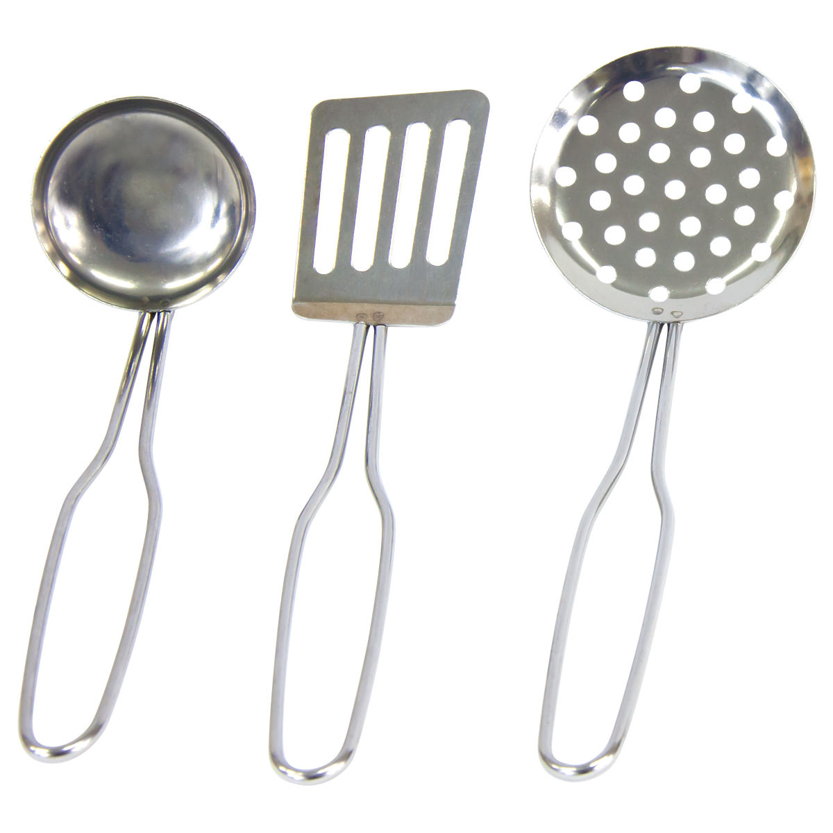 A set of kitchen cookware and utensils for little girls, for playing house. It includes pots with lids, a pan, small kitchen utensils, and an oven mitt. Suitable for indoor and outdoor play. Main features: 3 pots with lids, pan, ladle, strainer, spatula, and oven mitt