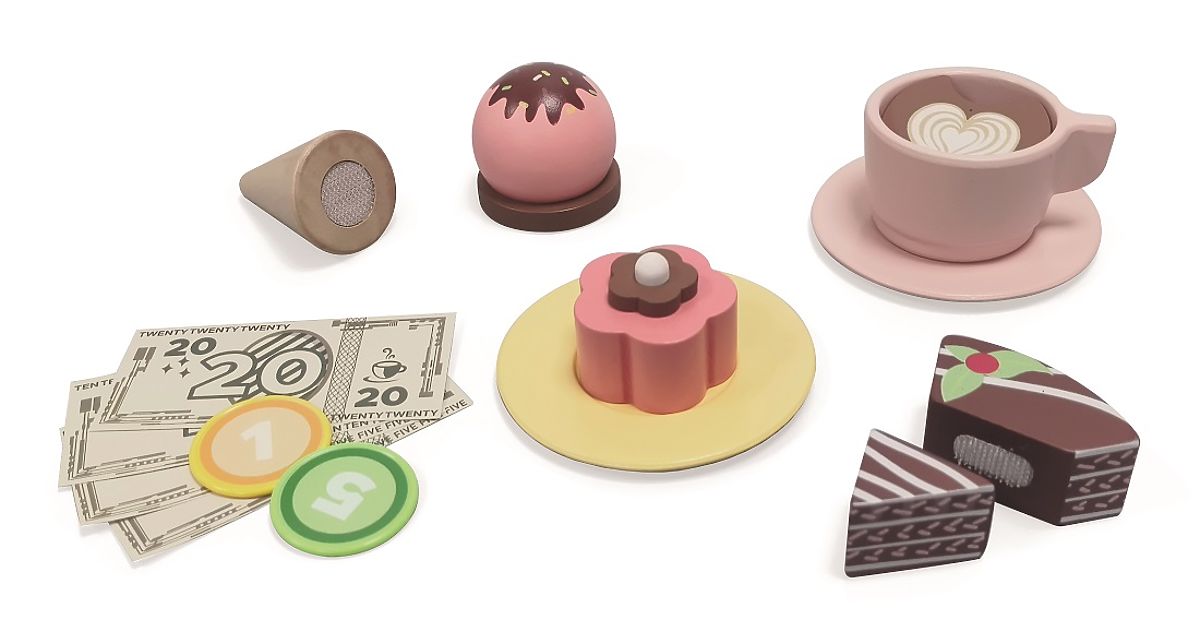 Become a real barista or shopkeeper! Fancy some ice cream, a cake, or just a delicious coffee? With this 46-piece set, you'll enjoy hours of fun. The set offers cups with saucers, cutlery and spoons, a counter with a coffee machine, a display case with cakes, and a shelf with holes for ice creams. There are also drawers with storage space for money, which are also part of this set. Role-playing toys spark children's imagination and inspire creative play, which also positively impacts their vocabulary and language development. Main features: contains 46 pieces, supports language and vocabulary development