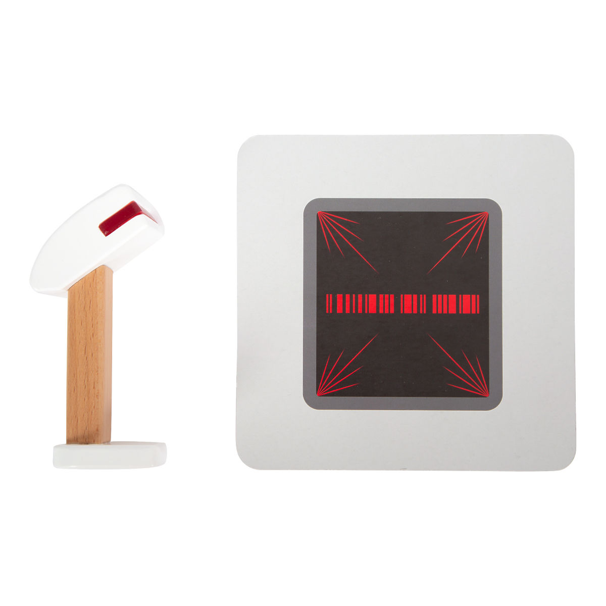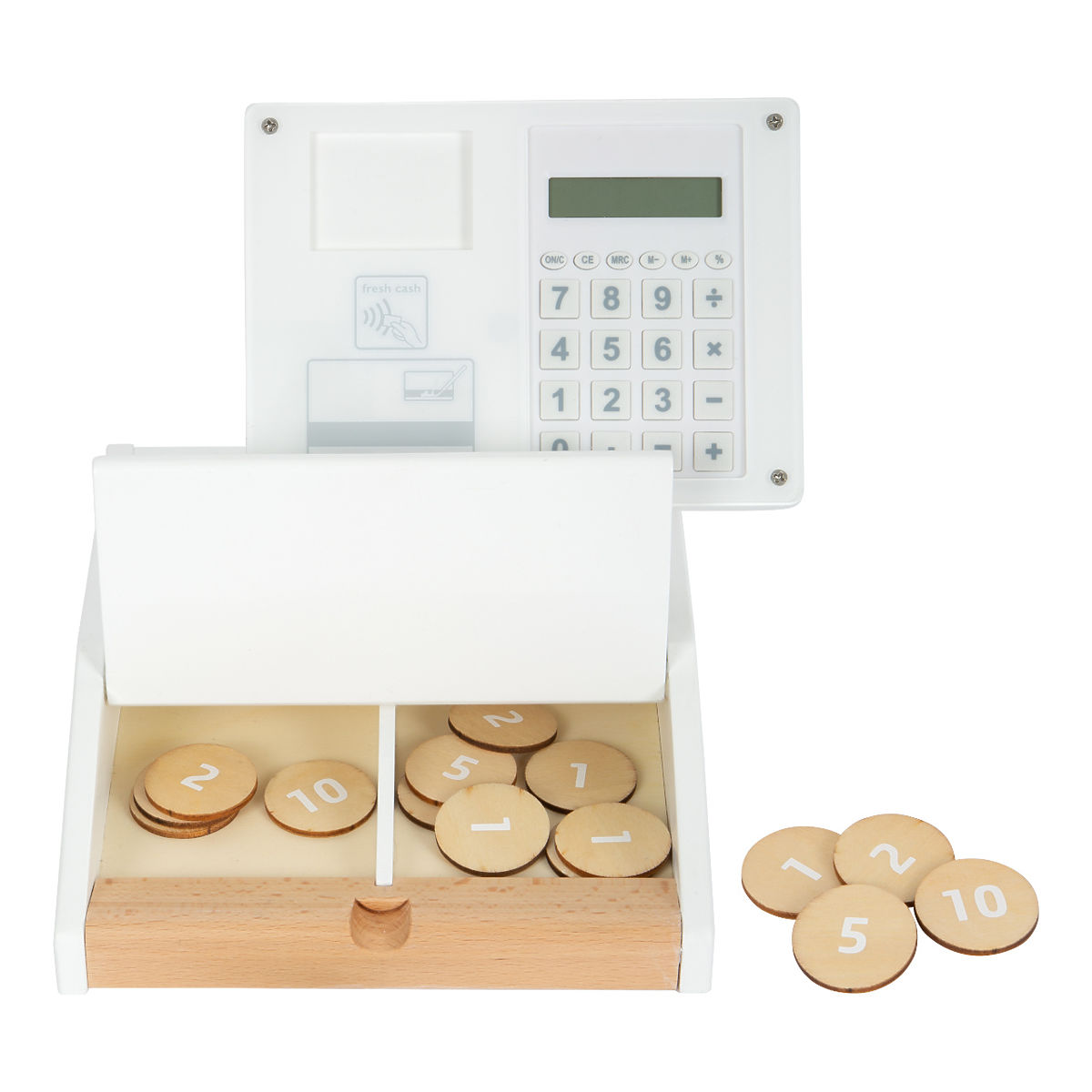 This beautiful and modern wooden cash register is perfect for children's market stalls. It features realistic accessories and fun functions. The package includes a barcode scanner, a roll of receipts, a monitor, a scanner, a debit card, product cards, and double-sided wooden coins. It also has a working calculator integrated into the monitor, an openable cash drawer with two compartments, just like in a real supermarket. Sign on the plexiglass with an erasable marker when paying by card. Batteries are not included. Want to pay like in a real supermarket? Then this cash register is just for you. Play shop right at home, learn to use money, improve your math skills, and use the calculator for large purchases. This high-quality cash register made of robust wood will delight all young shopkeepers. Main features: barcode scanner, roll of receipts, rotating monitor, working calculator, payment card, product cards, 15 double-sided wooden coins, large cash drawer can be opened, product cards are double-sided and can be inserted into the top of the monitor, sign with an erasable marker on the plexiglass when paying by card, children practice math by counting money and groceries, compatible with other products from the "Fresh" range, simple and modern Nordic design with visible wood.
