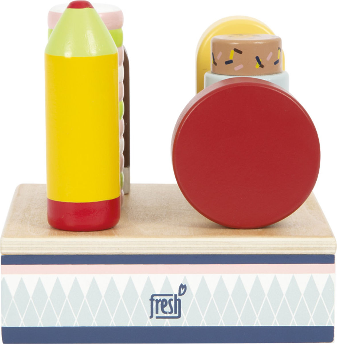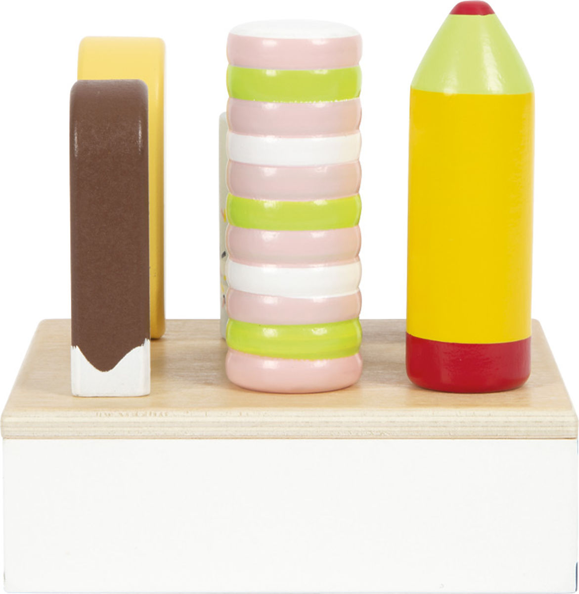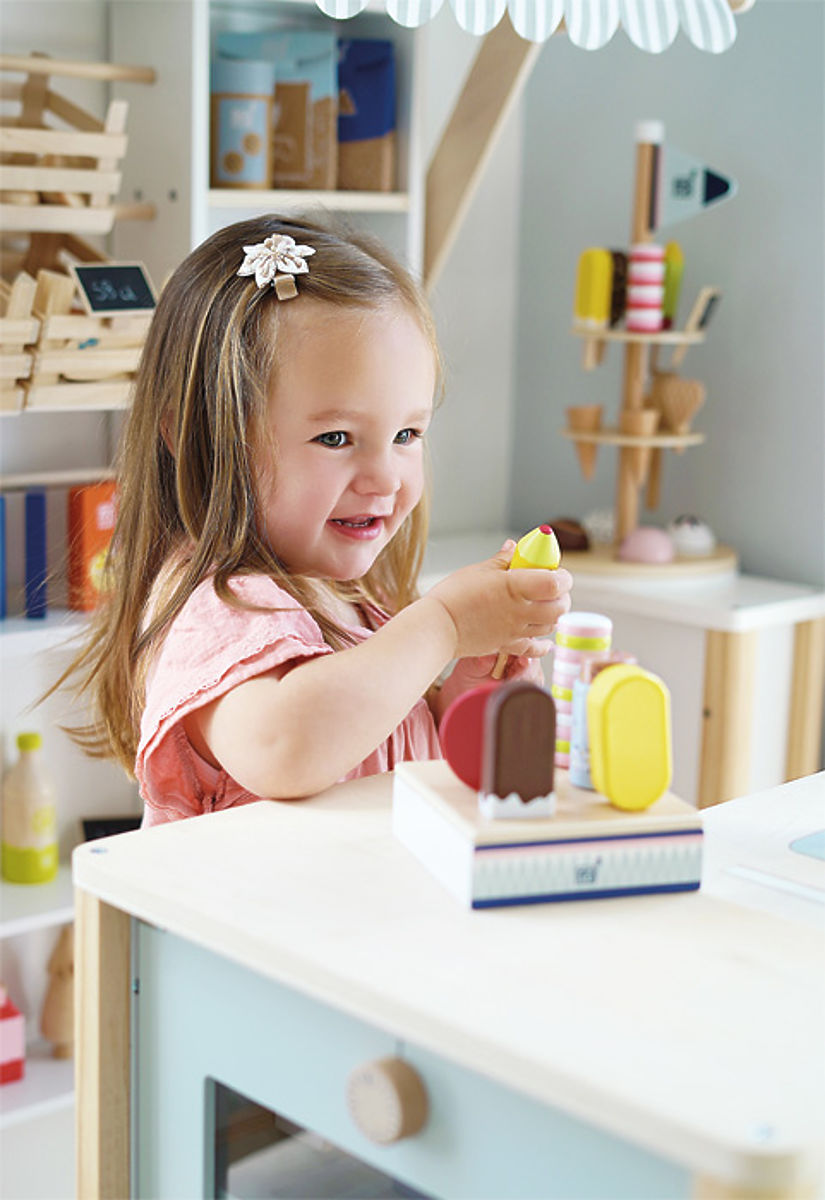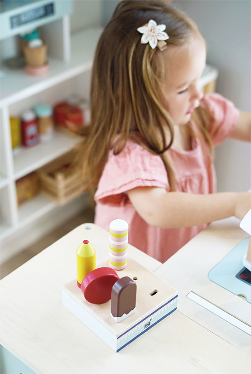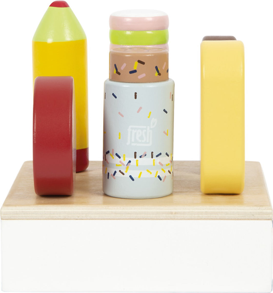 Ice cream set for little ice cream sellers. This practical ice cream stand with slots for 6 different flavors brings the refreshing feel of an ice cream parlor to a grocery store or children's kitchen. It also ensures that cold treats are served in the right style. Each individual ice cream is made from FSC® certified wood and looks very similar to its real counterparts. The delicate coloring and high proportion of visible wood make this play set a real eye-catcher in the children's room. Every child loves popsicles! The most popular travel ice cream option should not be missing in any child's room. The design and size of the ice cream stand are matched with the compact "fresh" ice cream counter (12416), so they complement each other ideally. Main features: 6 different types of ice cream made from durable FSC® wood ideal for the compact "fresh" ice cream counter (12416) popular addition to children's kitchens and grocery stores. The FSC® (Forest Stewardship Council) brand and certificate guarantee that the wood from which the product was made was not illegally harvested and comes from forests managed in an environmentally friendly or nature-friendly way, where strict environmental and social requirements are met. The FSC® label on the product means that by purchasing it, you help protect forests and support sustainable, responsible, or nature-friendly management, making our forests more stable, healthier, have a natural species composition, and better withstand the negative effects of climate change.