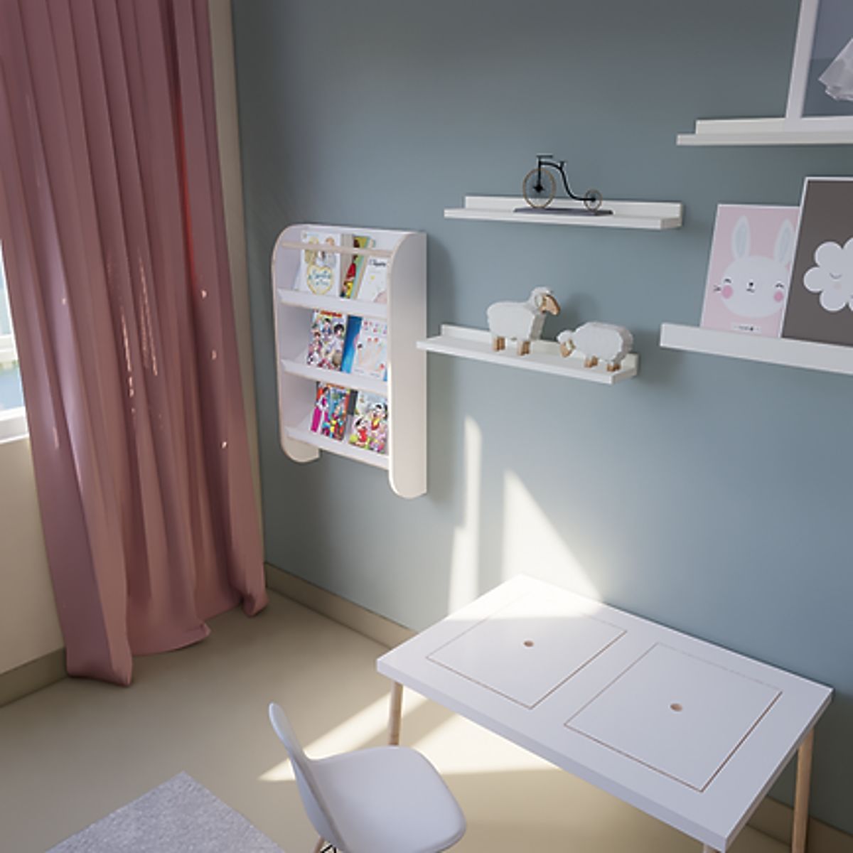 The bookshelf is the perfect place for your child to store their favorite books, fairy tales, and stories. With its low design and three practical shelves, it is tailored to the child's height, allowing them to sit down or reach for books on their own, without adult assistance.