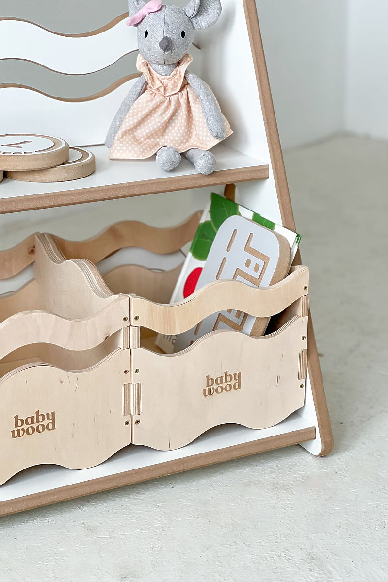 Bookshelf and toy storage with wavy fronts and natural materials. .. more