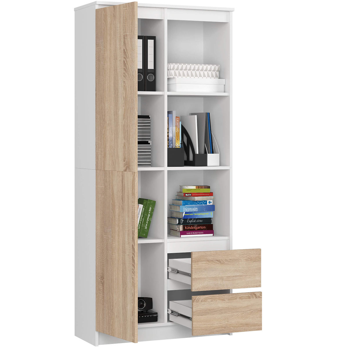 Office shelf with doors and drawers in a combination of white and sonoma colors.
