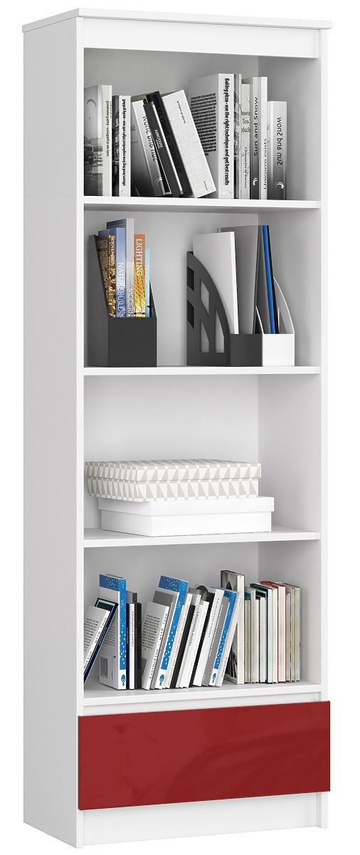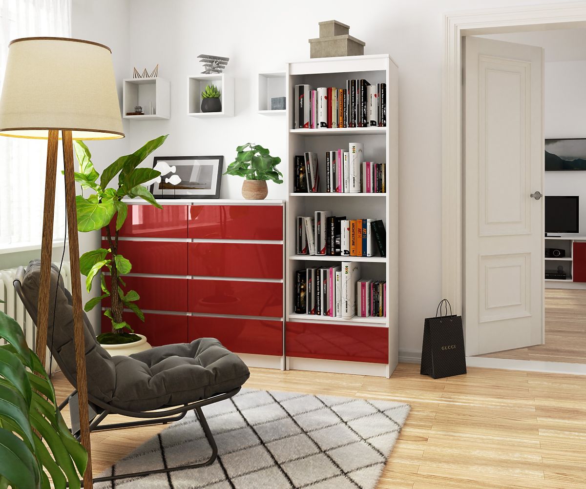 The shelf has four shelves and a spacious drawer at the bottom. The furniture body is made of abrasion and mechanical damage-resistant laminated board in white. The drawer front is made of lacquered MDF board with a high gloss in a beautiful shade of red. The shelf looks very impressive and fits interiors furnished in a modern style. The interesting combination of classic white and deep red makes the furniture, although simple, original and attention-grabbing. The red-white shelf can be used for books, document binders, decorative boxes for small items, or photo albums. The furniture is versatile enough to complement a corporate office, a student room, or a home study. The shelf is easy to keep perfectly clean by wiping the shelves and front with a damp cloth. The furniture is characterized by careful workmanship and perfect edge finishing with durable and aesthetic ABS edging.