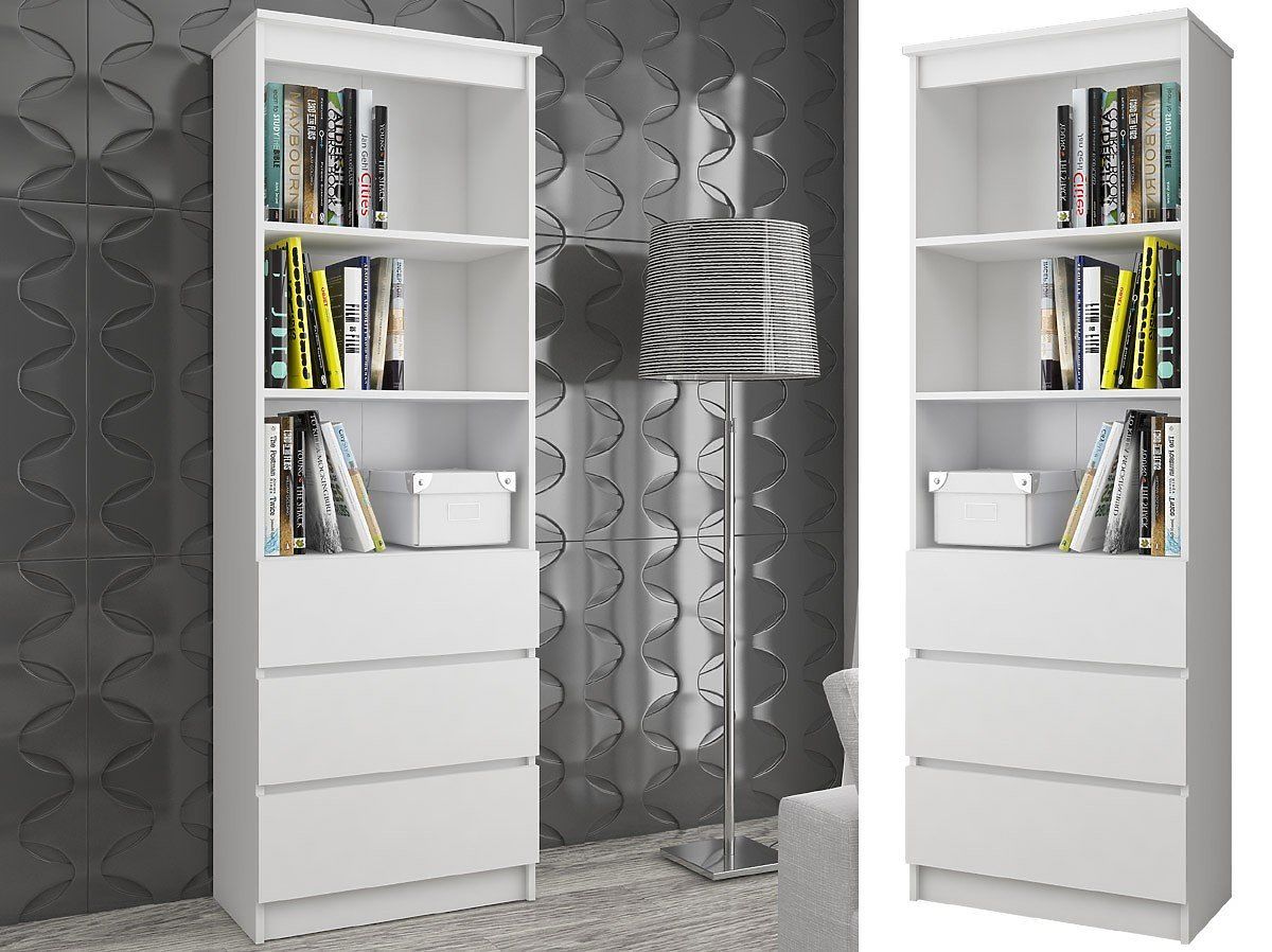 The office shelf with three drawers and two shelves is a practical and functional addition to any workspace. It can be used not only in the office but also at home, as the width of the shelves and drawers and their optimal number allow for storing books, documents, and other small items needed in daily life. Made from white lacquered laminated board, the office shelf with ABS edge banding is resistant to mechanical damage and abrasion, ensuring long-lasting use even under intensive conditions. It features shelves with adjustable height, allowing for the placement of variously sized accessories. Ball bearing slides by GTV in the drawers with pull-out lock ensure easy everyday use. The shelf is available in a universal size, with a height of 180 cm, width of 60 cm, and depth of 35 cm, making it suitable for various arrangements, both office and home.