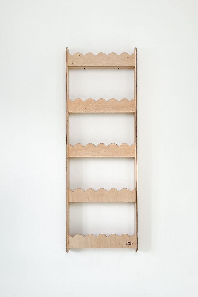 Wall-mounted natural shelf for books and toys, saving floor space. .. more