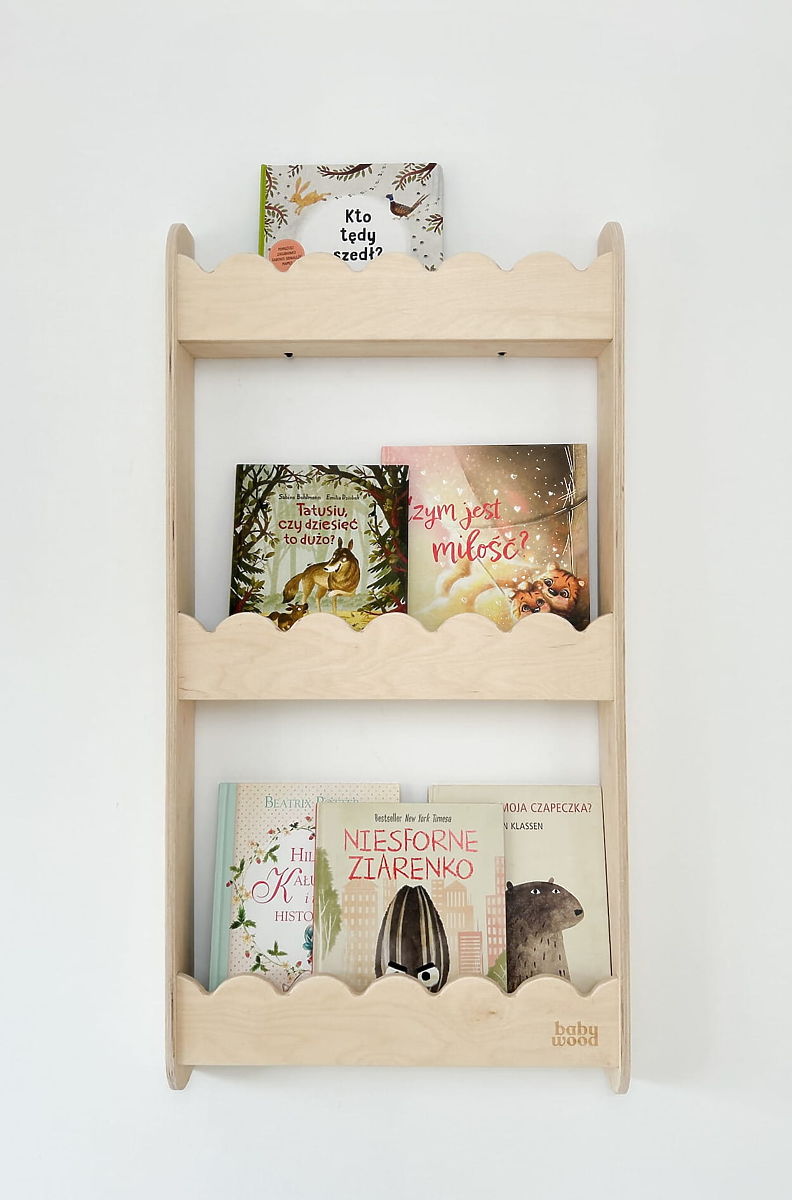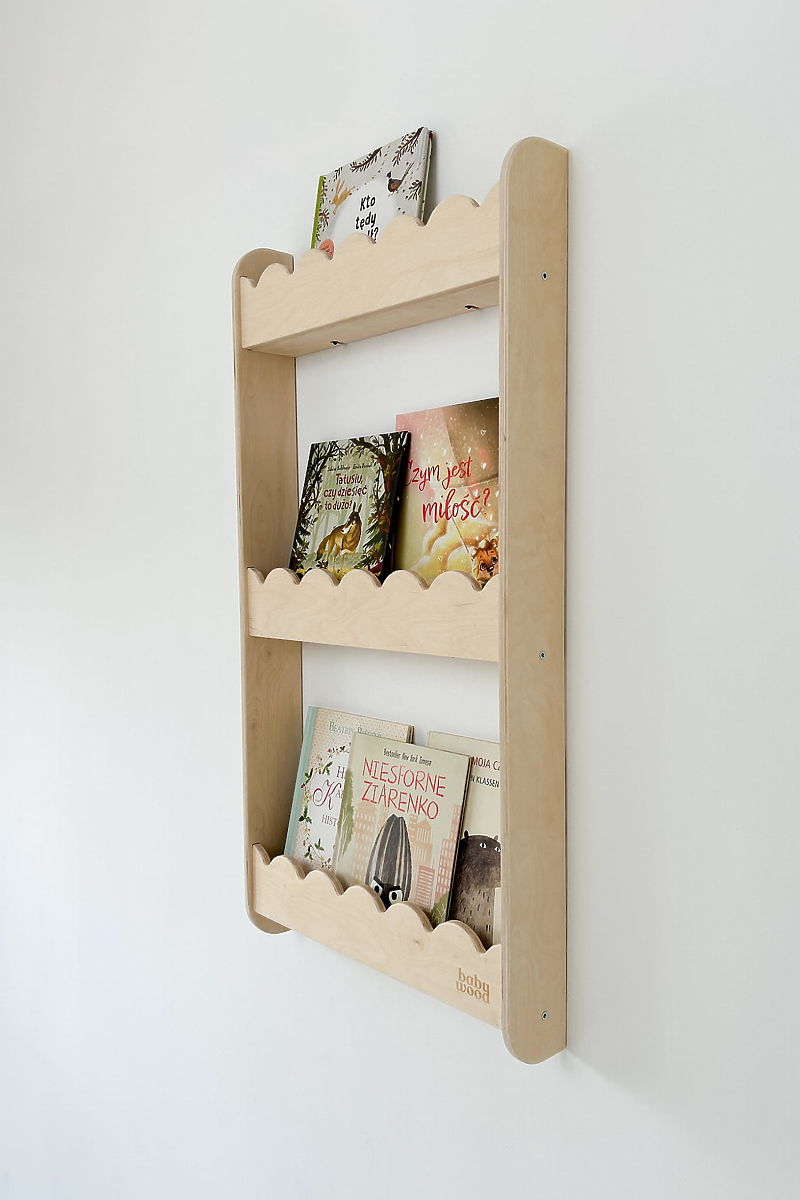 WAVE M Wall Shelf in a natural color is a practical and decorative bookshelf for the wall, helping to keep the children's room tidy without taking up floor space. It is ideal for books, toys, decorations, or small items of your child. Wall mounting allows for a free floor for play and other activities. The natural look and quality craftsmanship of the shelf add a cozy accent to the children's room. Rounded edges and smooth surfaces ensure safe use even for small children.