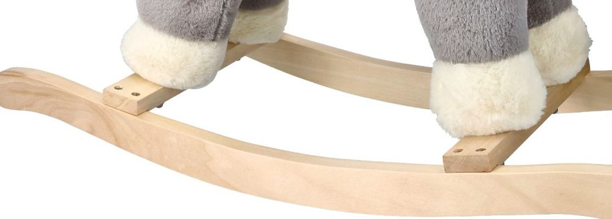 The beautiful horse is made of soft plush material in gray with white accents such as the mane, muzzle, and tail. The bridle and saddle are made in gray. The runners and handles are made of lightweight and pleasant-to-touch wood.