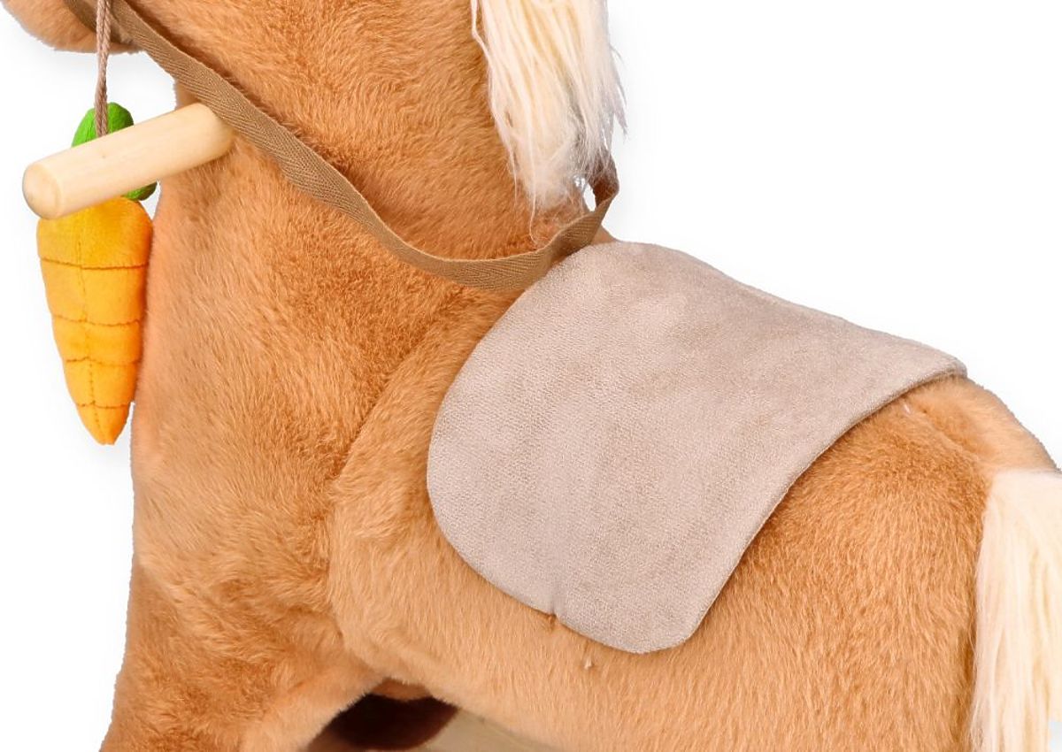 Look at this beautiful horse. What is it running towards? It joyfully gallops and invites you to play together. This is our newest rocking horse – joyful, eager, and full of zest for shared fun. And what does it get in return? Of course, lots of fun and a carrot.
