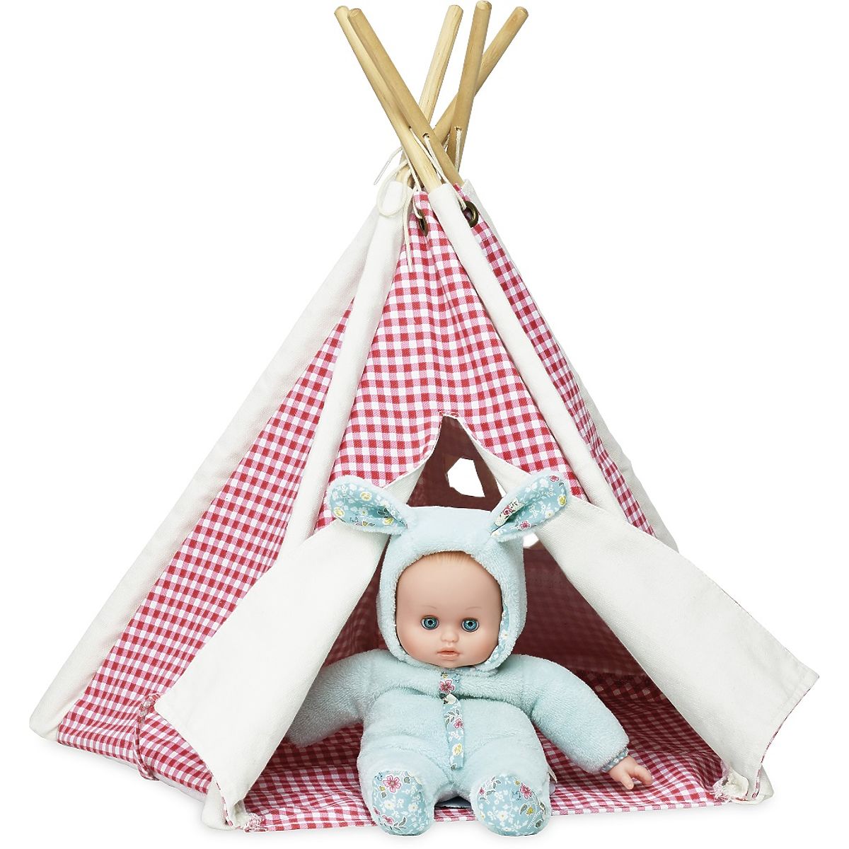 Beautiful checkered mini teepee, perfect for dolls. The wooden base with a textile cover is easy to assemble. The fabric is red and white. Main features: teepee for dolls, sturdy construction