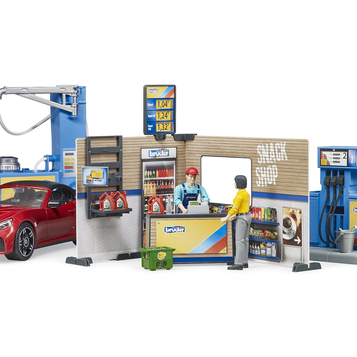 Bruder gas station set includes a car, 2 figures, and functional car wash. .. more