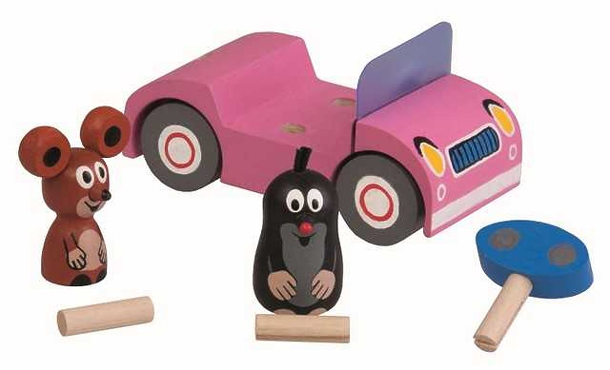 Little Mole with his friend Mouse in a pink car on a trip. The figures and the key can be freely removed and swapped. Main features: the product meets EU toy safety requirements, suitable for children from 3 years old © Zdeněk Miler