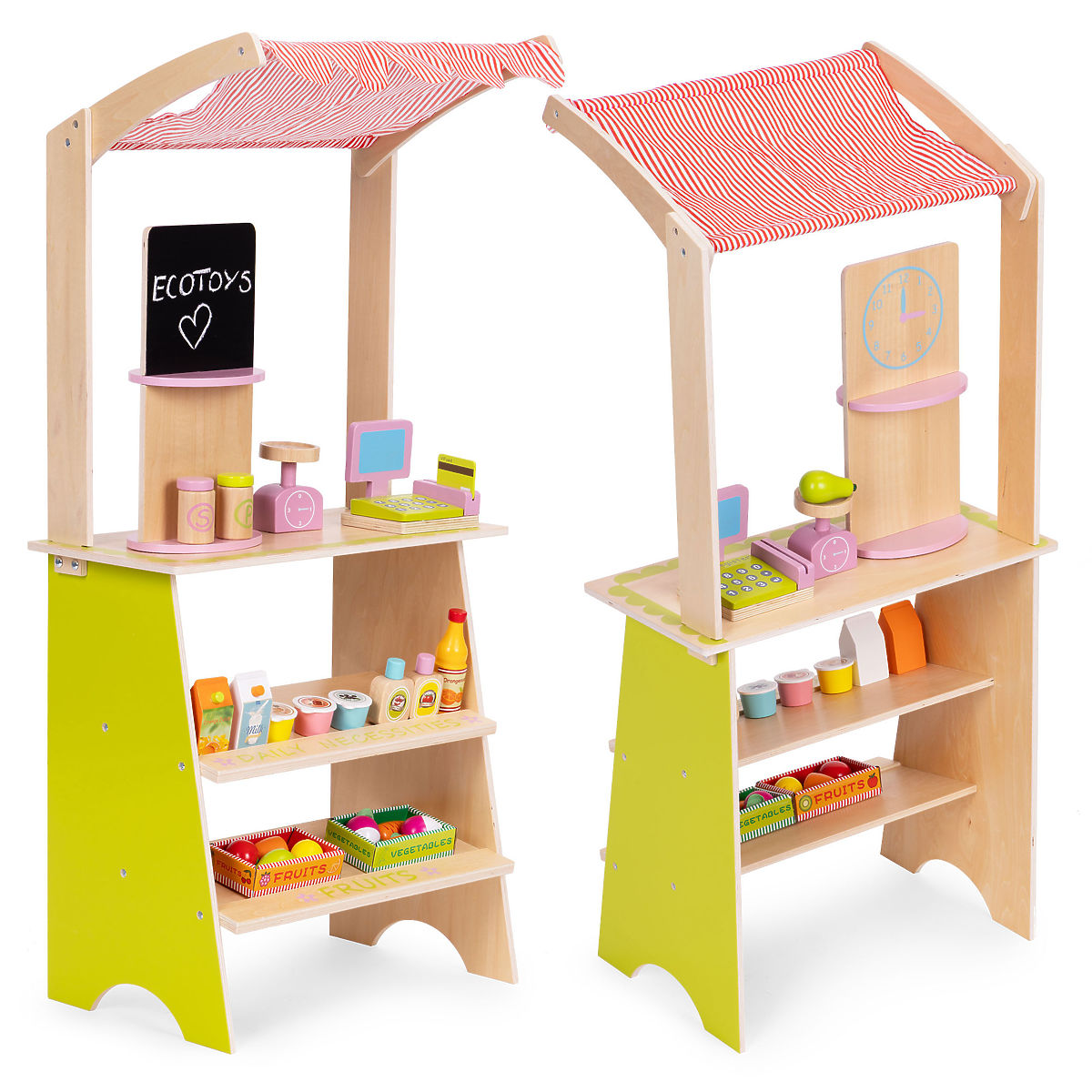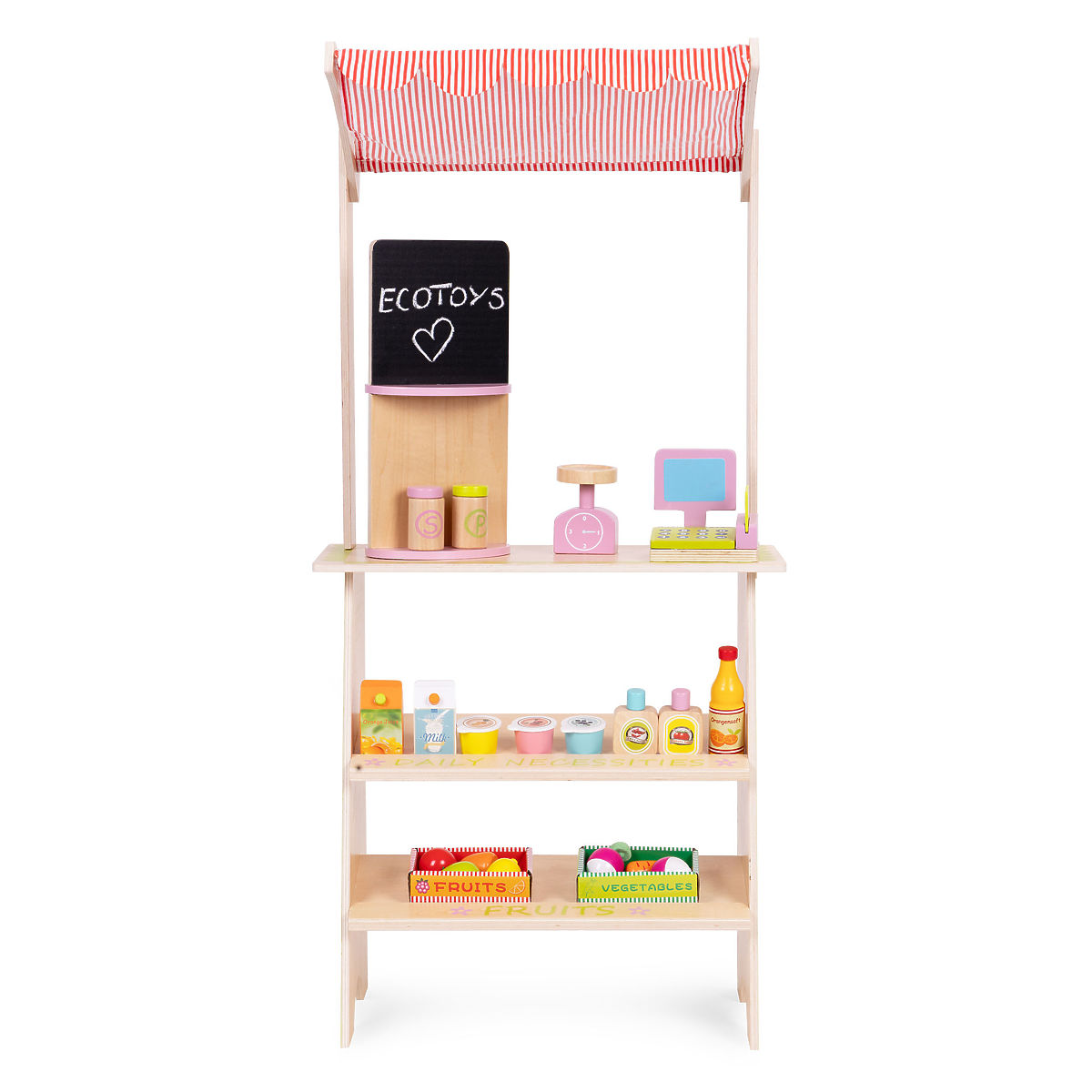 Wooden stand ECOTOYS encourages children to engage in active role-playing, teaching basic social behaviors like shopping, selling, and counting. The toy is ideal for home, kindergarten, or playroom. It's a great tool for learning cooperation, communication, and creative thinking. With the presence of a cash register, terminal, scale, and numerous food products, the play becomes realistic and engaging. The product develops hand-eye coordination, stimulates imagination, and encourages children to act independently.
