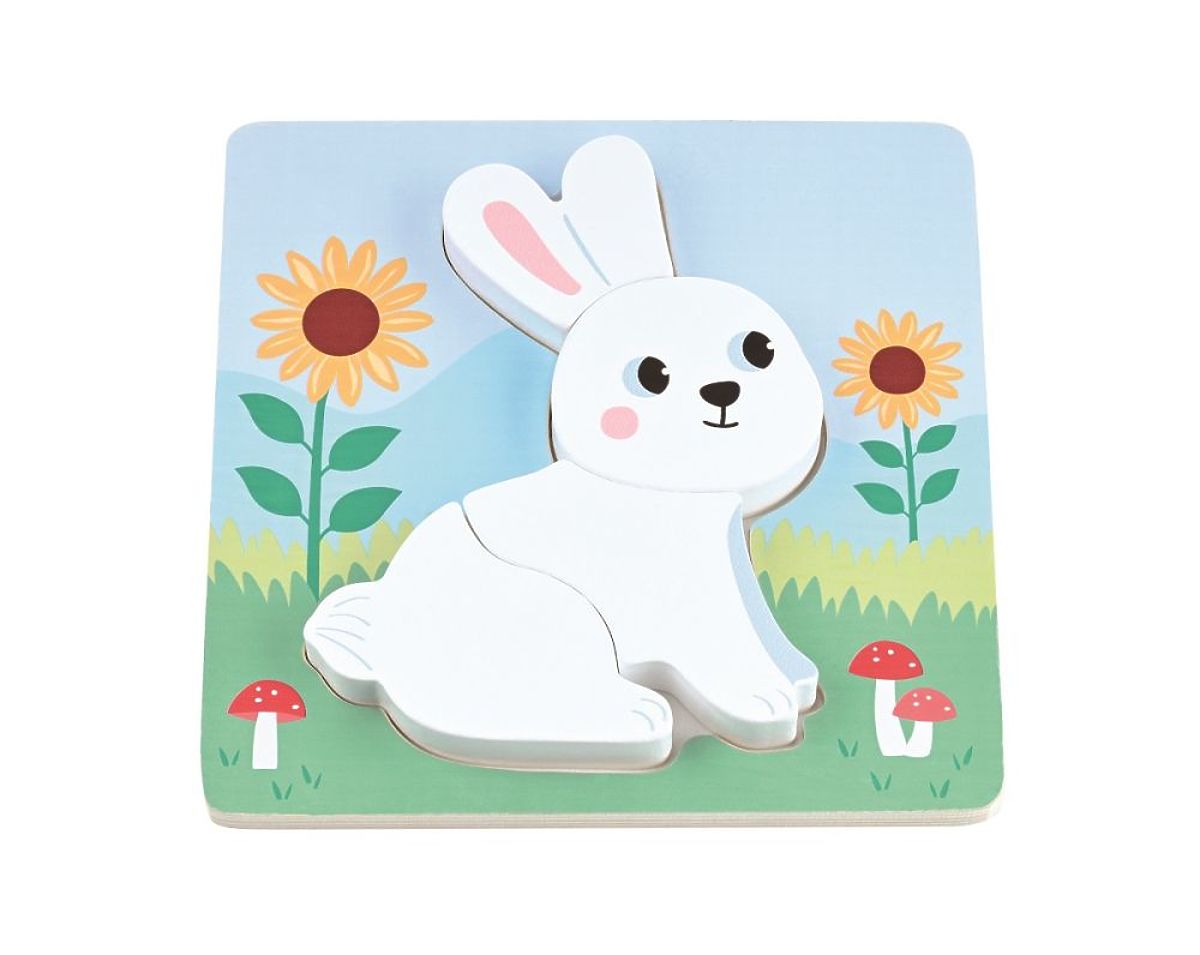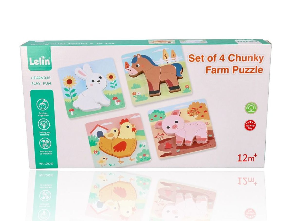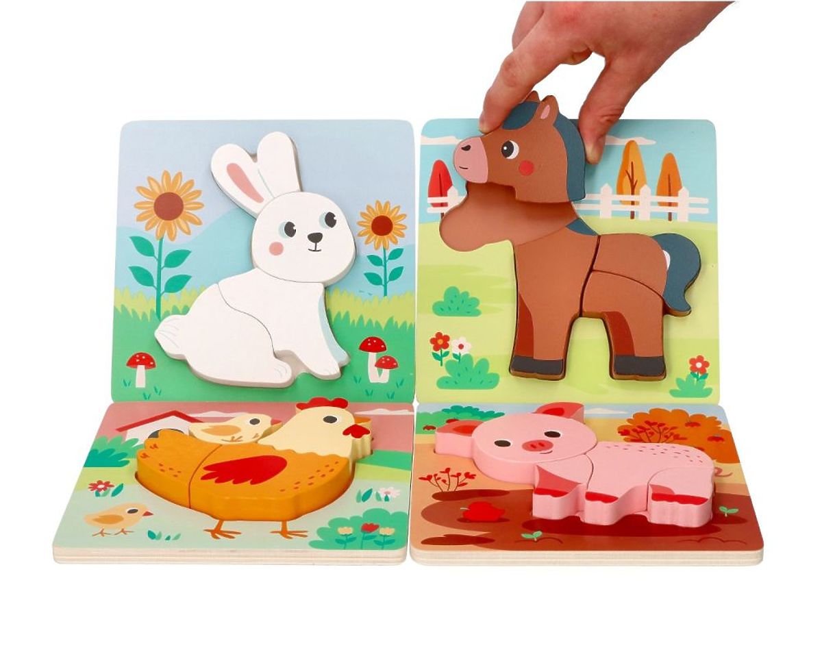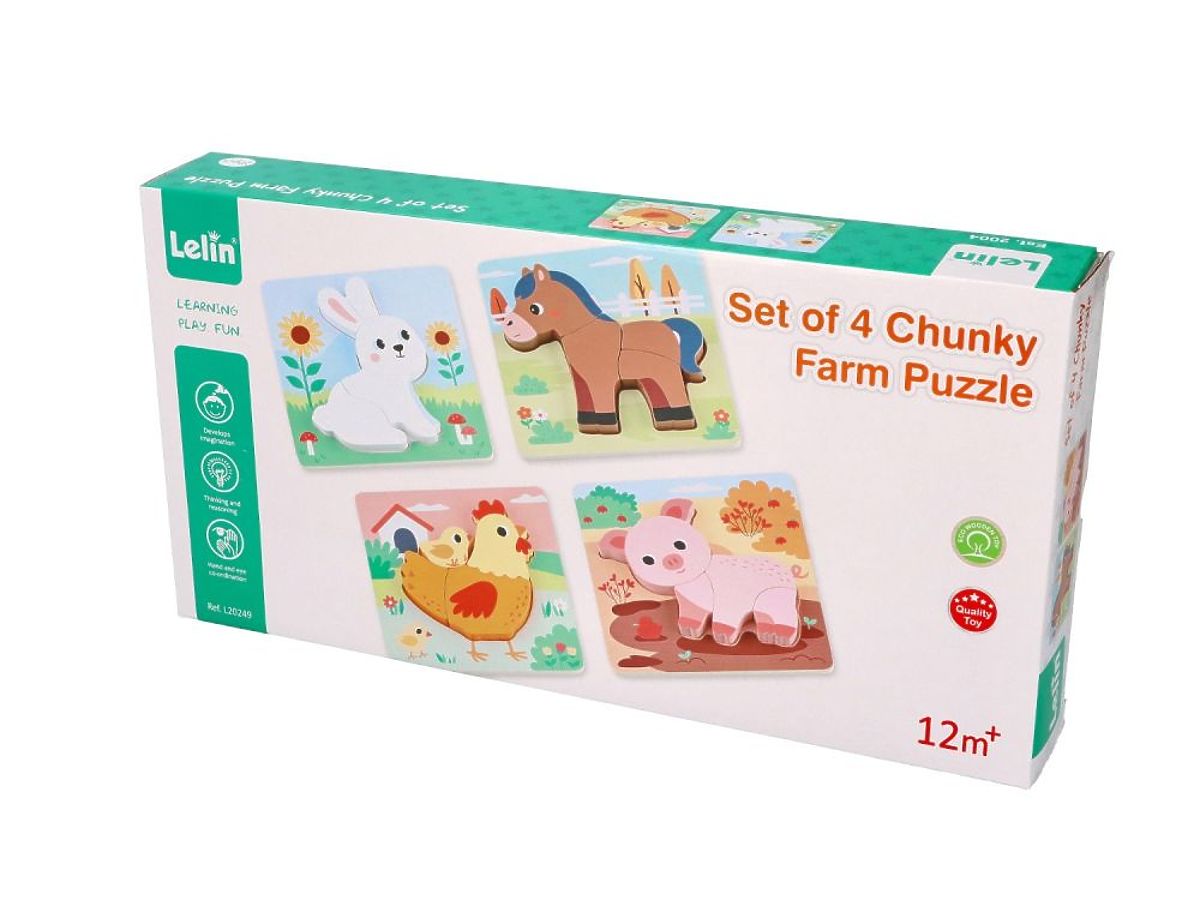 The set includes 4 puzzles featuring cute animals: a bunny, a horse, a hen with a chick, and a piglet.