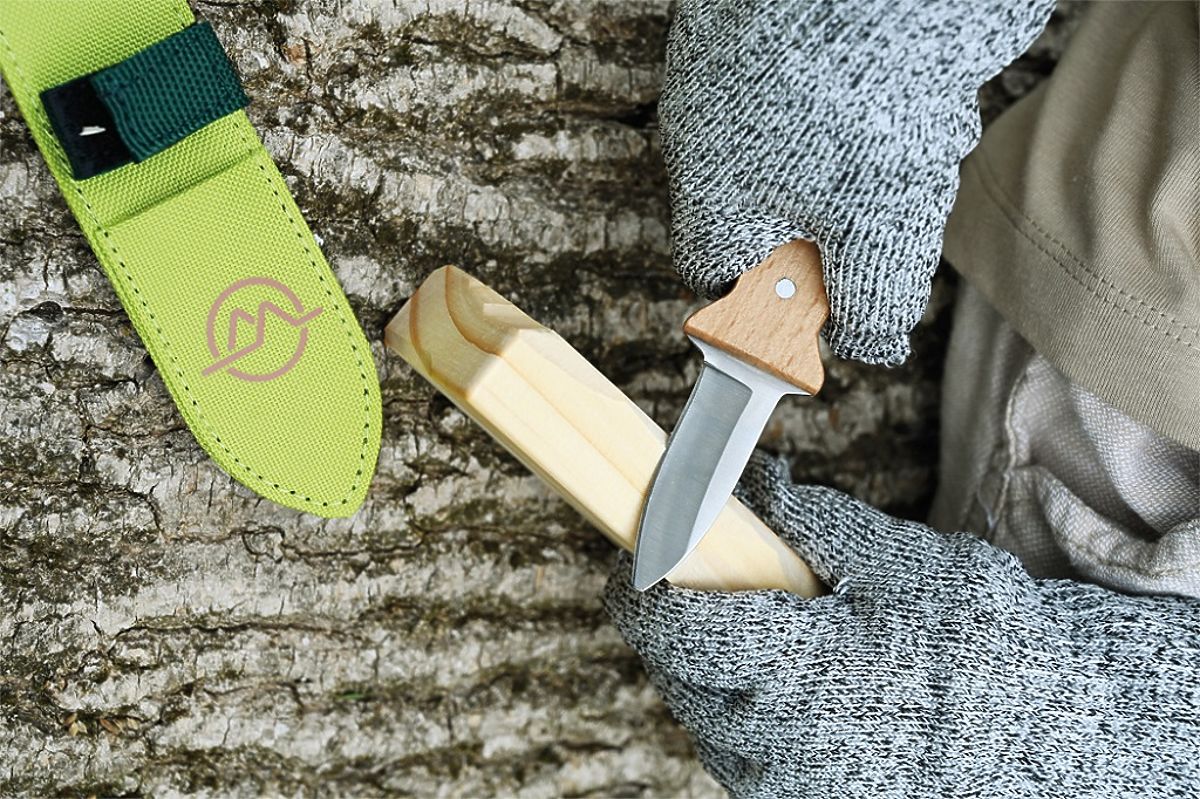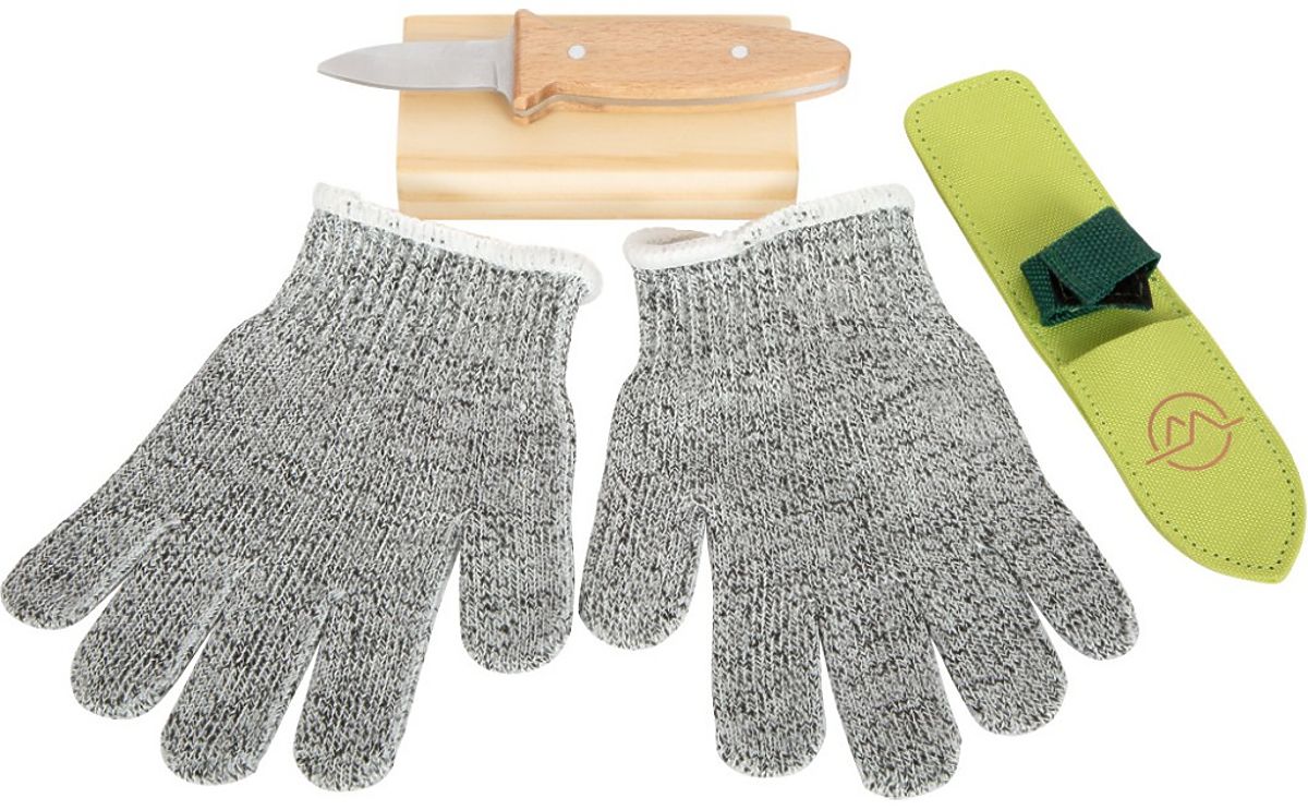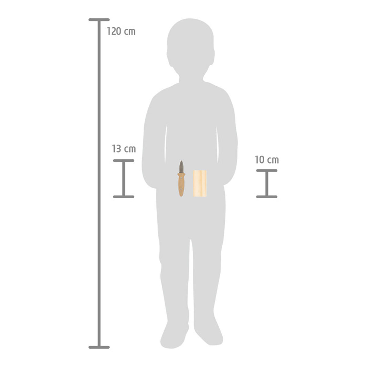 Do you want to split sticks, slice fruit, or prepare a stick for roasting? With the outdoor children's knife, it's no problem! Thanks to the short, robust blade with a blunt tip, compact dimensions, and a wooden handle perfectly shaped for children's hands, kids can gain their first experiences with carving and handling a knife. The knife is safely stored in a fabric sheath with hooks and loops for attaching to a belt. The set is complemented by a pair of special cut-resistant gloves and a wooden carving block. The blade of this outdoor knife is sharp because dull blades are by no means safer than sharp ones! When cutting with a dull knife, you have to use much more force, which increases the risk of the knife slipping and causing injury. Children's carving knives should, of course, always be used under adult supervision and within firmly established rules. Knives are not toys, but tools! They are perfect for trips into nature, adventures, and expeditions - because with children's outdoor and exploration equipment, the world outside becomes an exciting place full of adventures! Main features: includes 5 pieces, short, robust blade (single-sided sharpened) and blunt knife tip, equipment especially suitable for nature and exploration
